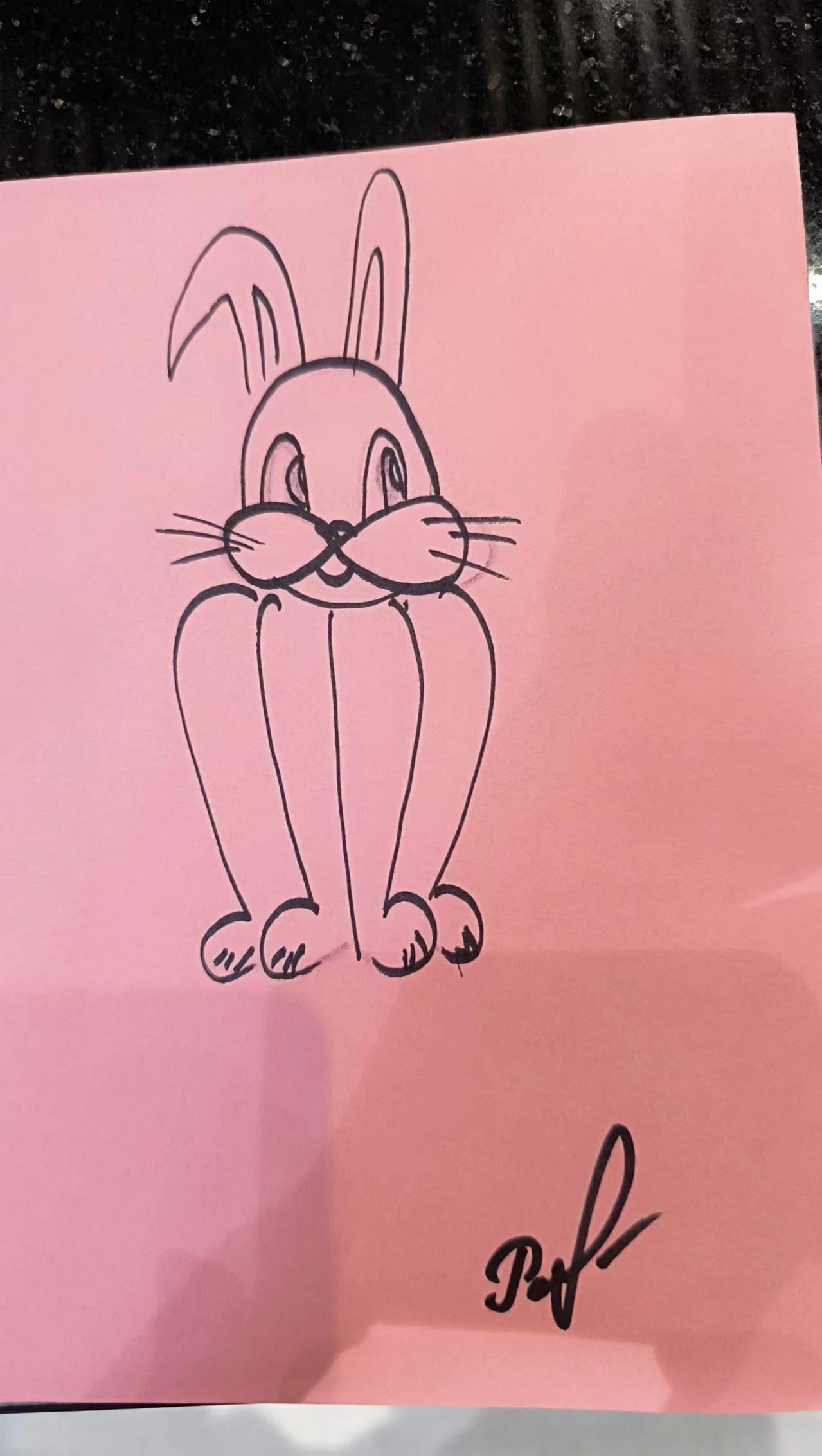 这幅手稿展示了一只卡通兔子,线条简单流畅,富有表现力。形状设计上,兔子的耳朵和身体使用了夸张的弧线,给人活泼和俏皮的感觉。颜色单一,但粉色纸张的选择增加了整体的温暖和可爱氛围。整体构图平衡,兔子的表情传达出一种调皮和好奇的情感,增强了整体的情感表达。