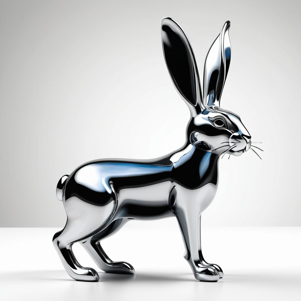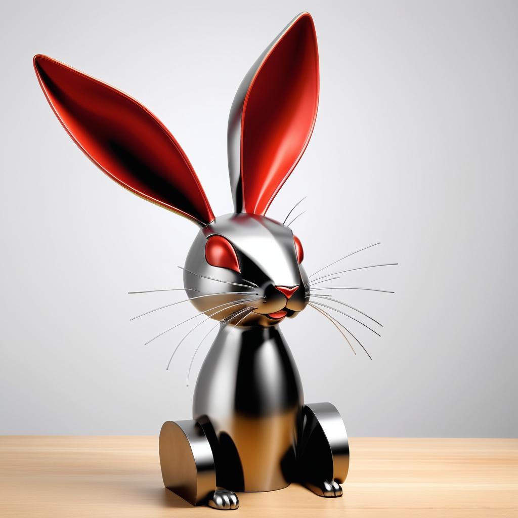 可以将这幅手稿中的卡通兔子形象转化为一件现代雕塑作品。使用光滑的金属材质来表现兔子的光滑曲线,并通过拉长耳朵和四肢的比例来增加雕塑的趣味性和视觉冲击力。基础形状保持简洁,使其成为空间中的亮点。通过金属材质的光影变化,进一步增强雕塑的动感和活力。
