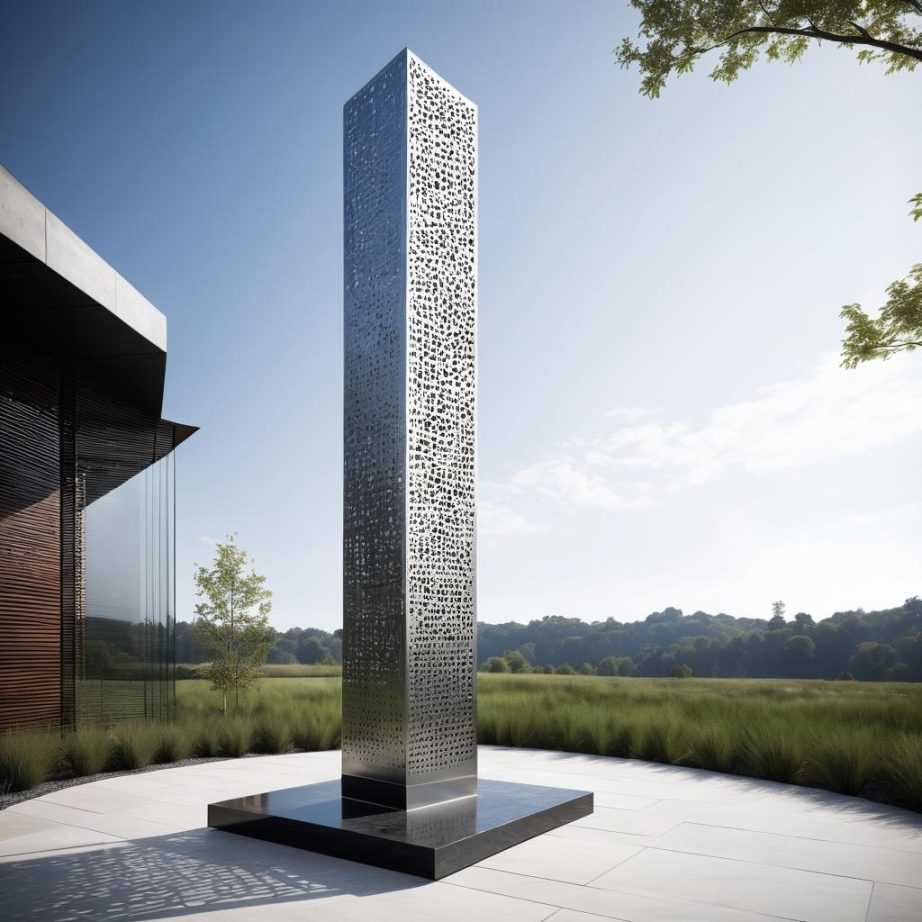 这个高耸的建筑物可以转化为一座现代雕塑,强调其简洁的垂直线条和现代感。可以使用金属材料,如不锈钢或铝,来捕捉光影效果,并利用光滑的表面反射自然环境中的色彩变化。雕塑的设计应保持简约,凸显结构的高度和优雅,底部可以加入自然元素,如石材基座,增加其稳定性和与环境的融洽感。