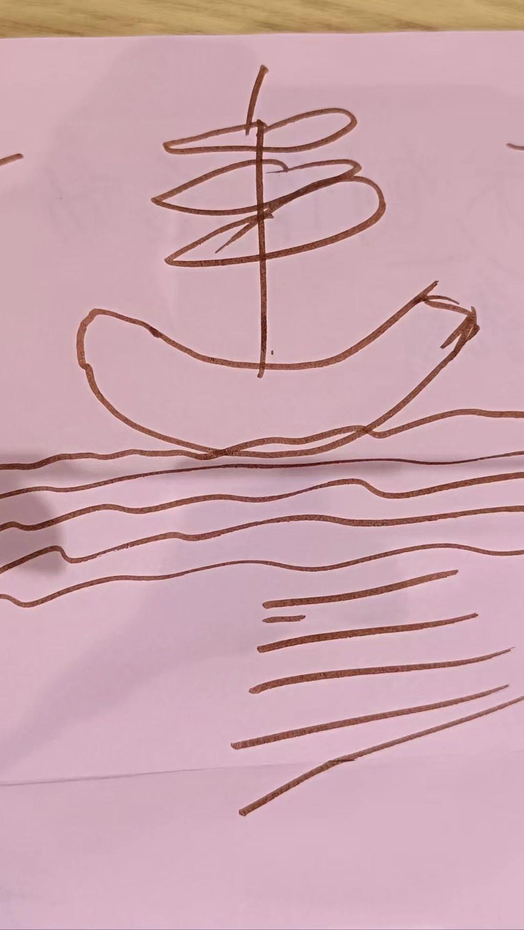 这幅手稿描绘了一艘帆船在海面上航行的简约场景。线条的流畅性和简洁的构图传达出宁静与自由的情感。船体和帆的形状具有轻盈的动感,海浪的线条则增强了画面的动态效果。整体构图中,船帆的曲线与波浪的弧度形成了视觉上的和谐,表现出一种自然的平衡感。