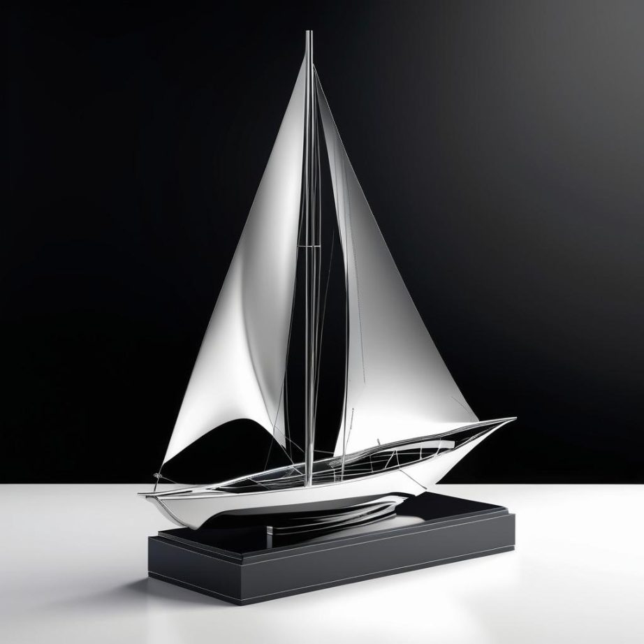 可以将这幅手稿转换为一件现代雕塑作品。雕塑设计可以通过夸张船帆和船体的曲线来增强作品的动感。材质上,可以选用不锈钢或玻璃纤维,以反射光线并增加视觉吸引力。雕塑的底座可以设计成波浪形,使用抛光的金属材料来模拟海面的反光效果。整体风格应保持简洁,但通过形状的动态和材质的光泽来增强整体的表现力。