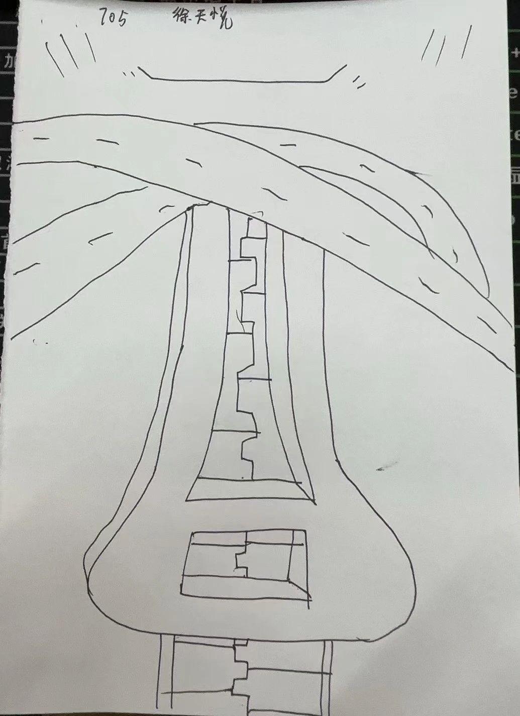 这幅手稿通过流畅的线条和简洁的几何形状表现出一种现代感。线条的交错和形状的分割形成了独特的视觉冲击力,展现出一种动态的平衡。尽管手稿中没有色彩,但其结构设计本身传达出一种力量与凝聚力。整体情感表达上,作品给人一种坚韧与稳固的印象,仿佛是建筑与自然的结合。