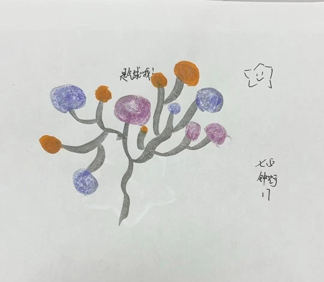 这幅手稿展现了抽象的树形结构,利用简约的线条和圆形构造来表达自然的生命力。线条的流畅性和枝干的分布体现出一种有机的和谐。色彩上采用了紫色和橙色的对比,这种选择带来了活力与温暖的情感表达,营造出一种轻松且梦幻的氛围。整体构图平衡且动态,仿佛在讲述一个关于自然与生命成长的故事。