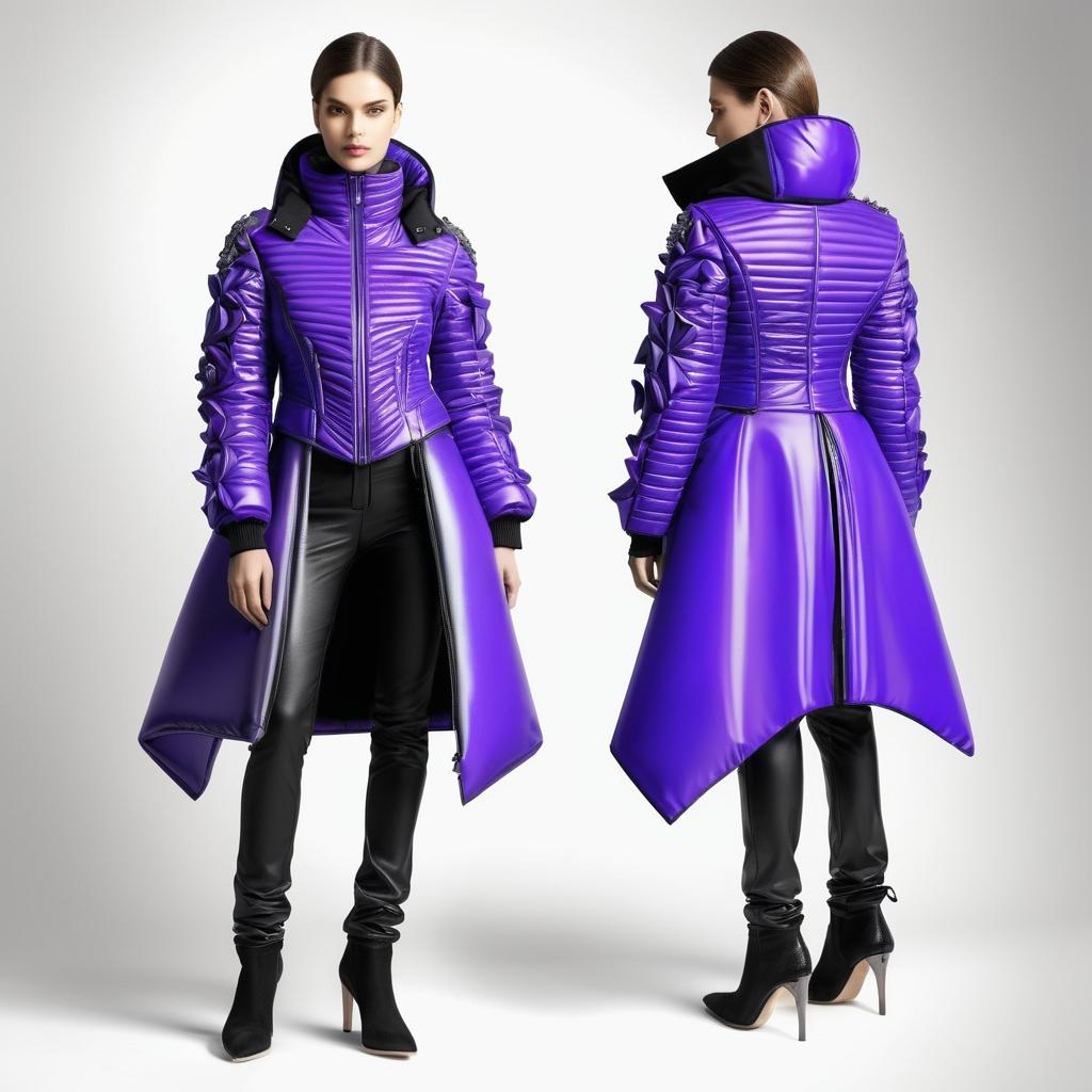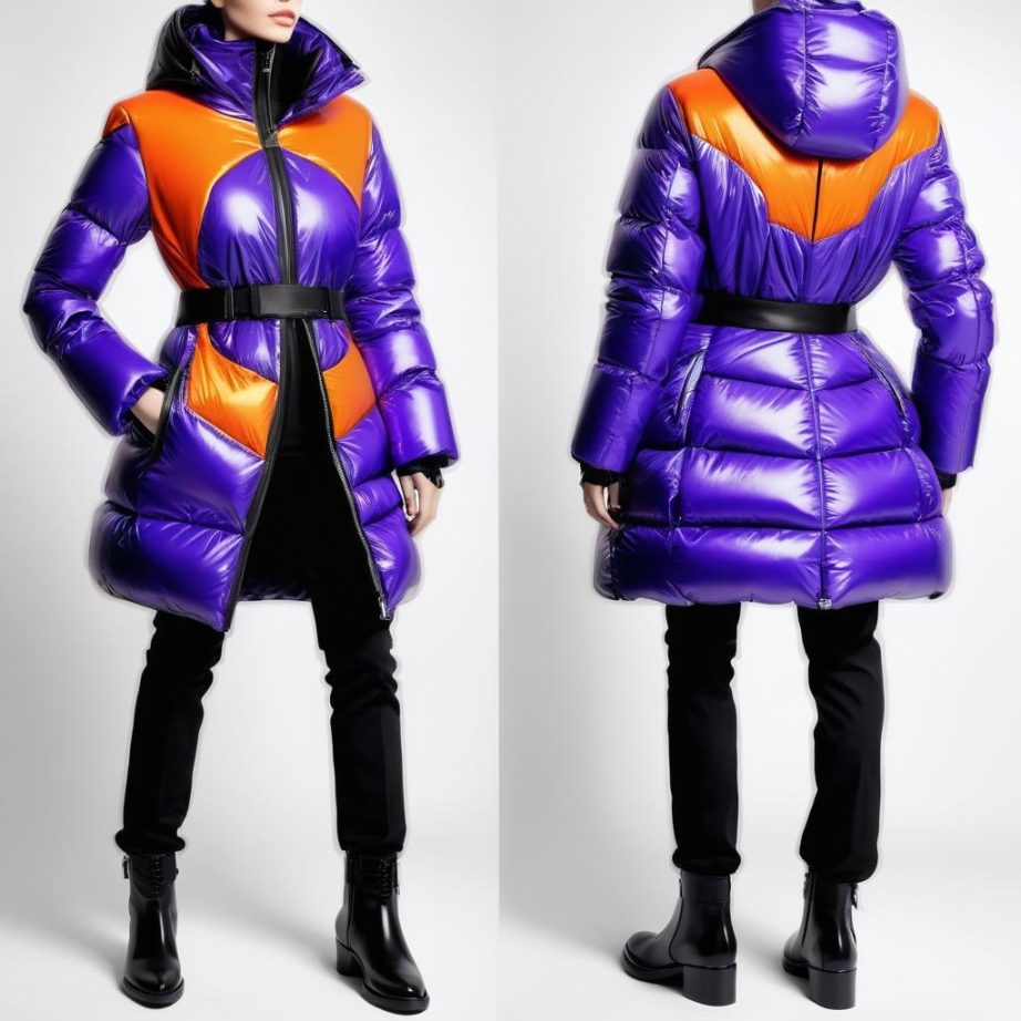 从这幅手稿中可以借鉴其流畅的线条和独特的形状设计,将其转化为羽绒服的剪裁与装饰细节。可以考虑在羽绒服的肩部和袖口运用这种分枝状的线条设计,增加服装的层次感和动态视觉效果。色彩方面可以采用手稿中的紫色和橙色作为羽绒服的主色调,引入对比色块来增加视觉冲击力。面料可以选择具有光泽感的材质,以增强颜色的表现力。确保设计由真人模特展示,凸显出羽绒服的整体效果和穿着体验。
