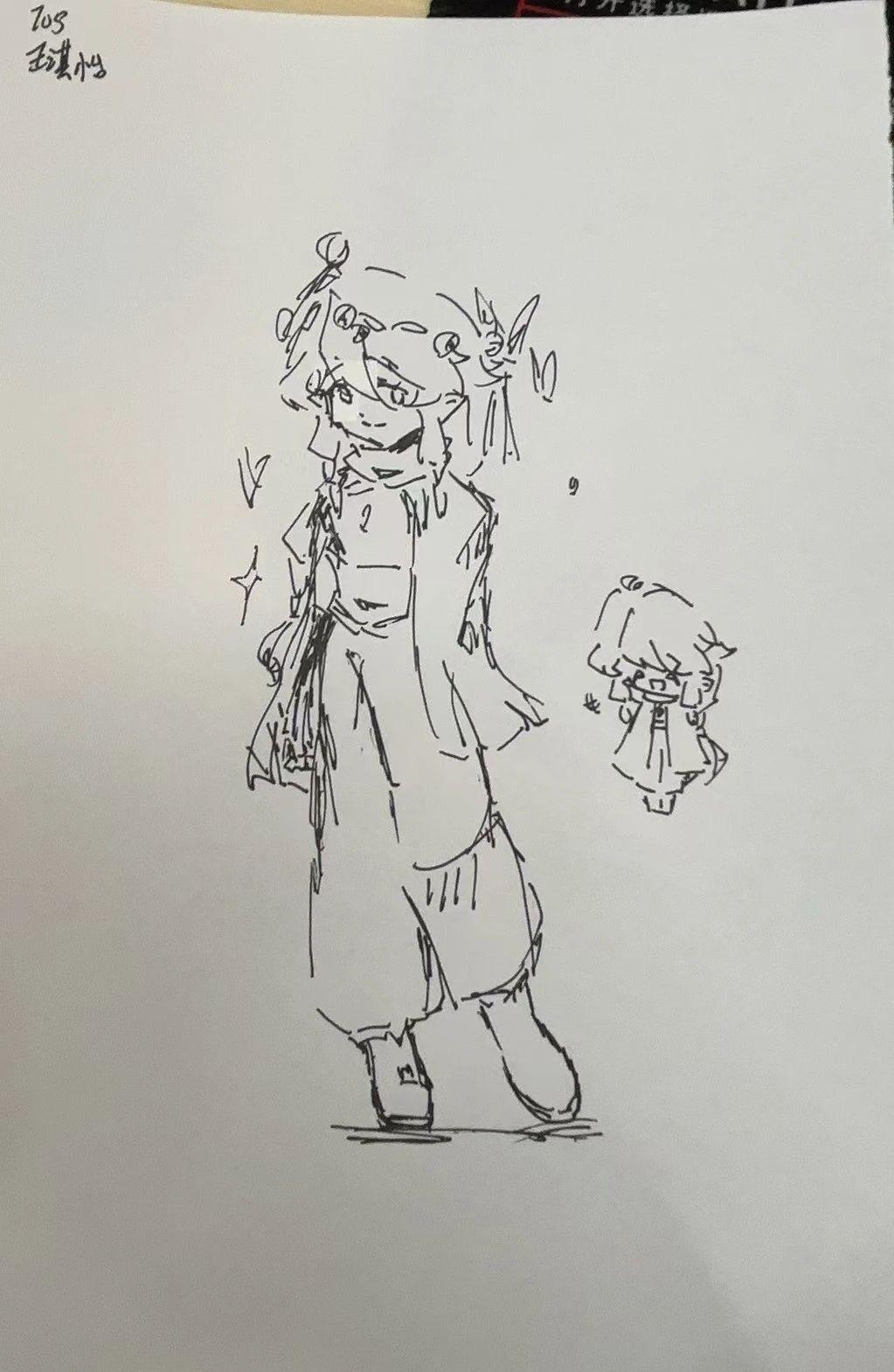 这幅手稿采用了简约而富有表现力的线条,人物形象生动活泼,展现了一种轻松和愉悦的情感。线条的流畅性使得角色姿态自然,形状的构造虽然简单,但却充满个性。背景的留白增强了主体的突出效果,整体构图具有动态的平衡。