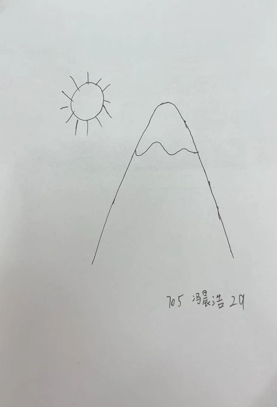这幅手稿以简洁的线条呈现了一座山和一个太阳。线条流畅,构图简单而具有平衡感。山的形状具有独特的锥形结构,顶部的雪线增加了视觉焦点。太阳的呈现则通过简练的线条辐射出光芒,传达出一种自然景观的静谧与和谐。整体情感表达朴素而自然,具有一种宁静的力量。