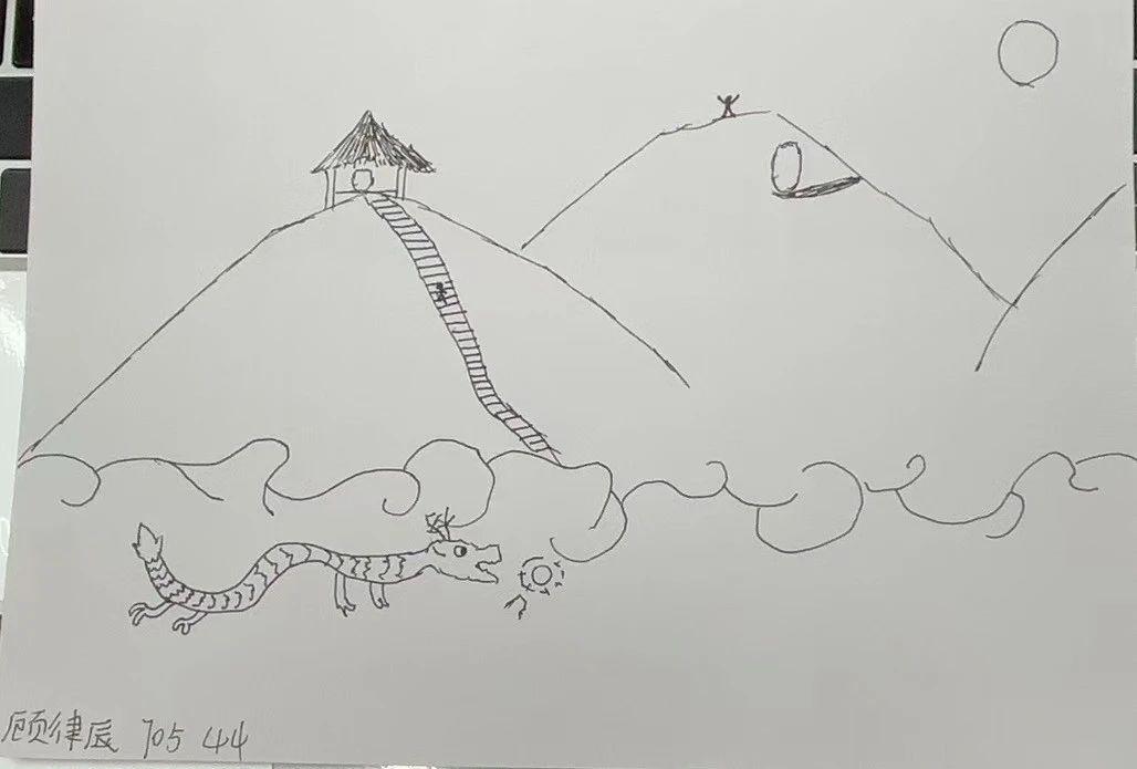 这幅手稿展示了一条龙在山间的情景。线条简单却富有表现力,山的轮廓和龙的形象描绘出一种原始的自然力量。山顶的小屋和人影增添了人文元素,云的流动性与龙的形态形成对比,创造出一种动态的平衡。整体情感表达出人与自然的和谐关系。