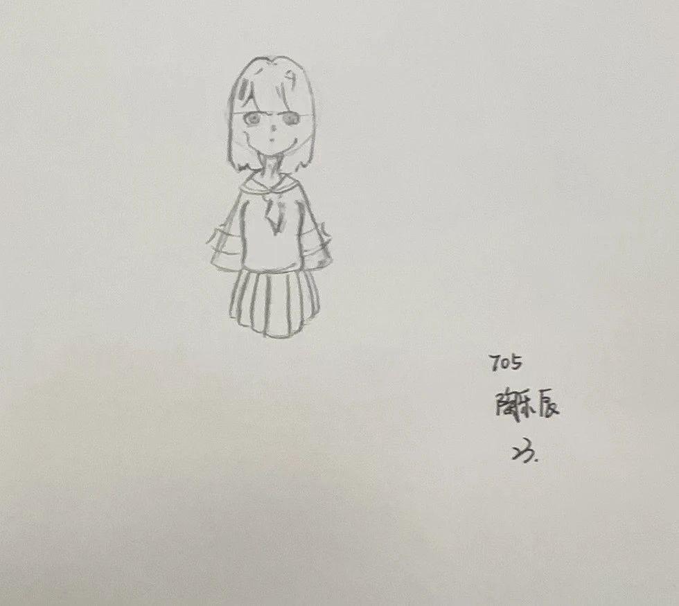 这幅手稿展示了一位穿着水手服的角色,线条简单而富有表现力,带有卡通风格。人物形象的简约构成和略显夸张的头部比例突出情感表达。整体构图较为中规中矩,中心人物的姿态和服饰细节涉及到青春和活力的主题,尽管设计简单,但传递了温柔和纯真的情感。