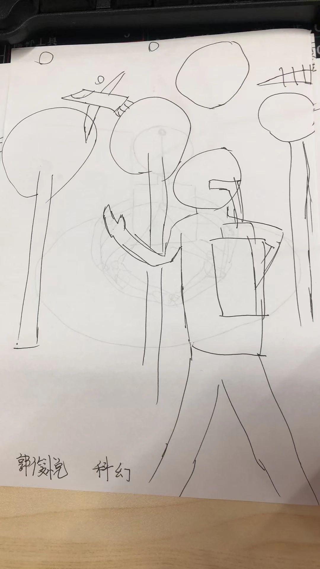 这幅手稿运用了流畅而简洁的线条,展现出一种极简主义的风格。人物的形态和背景中的圆形物体相互呼应,形成了一种有趣的对比和节奏。线条的随意和形状的简单构造,营造出一种轻松而梦幻的氛围。整幅作品呈现出一种开放性,激发观众的想象力。