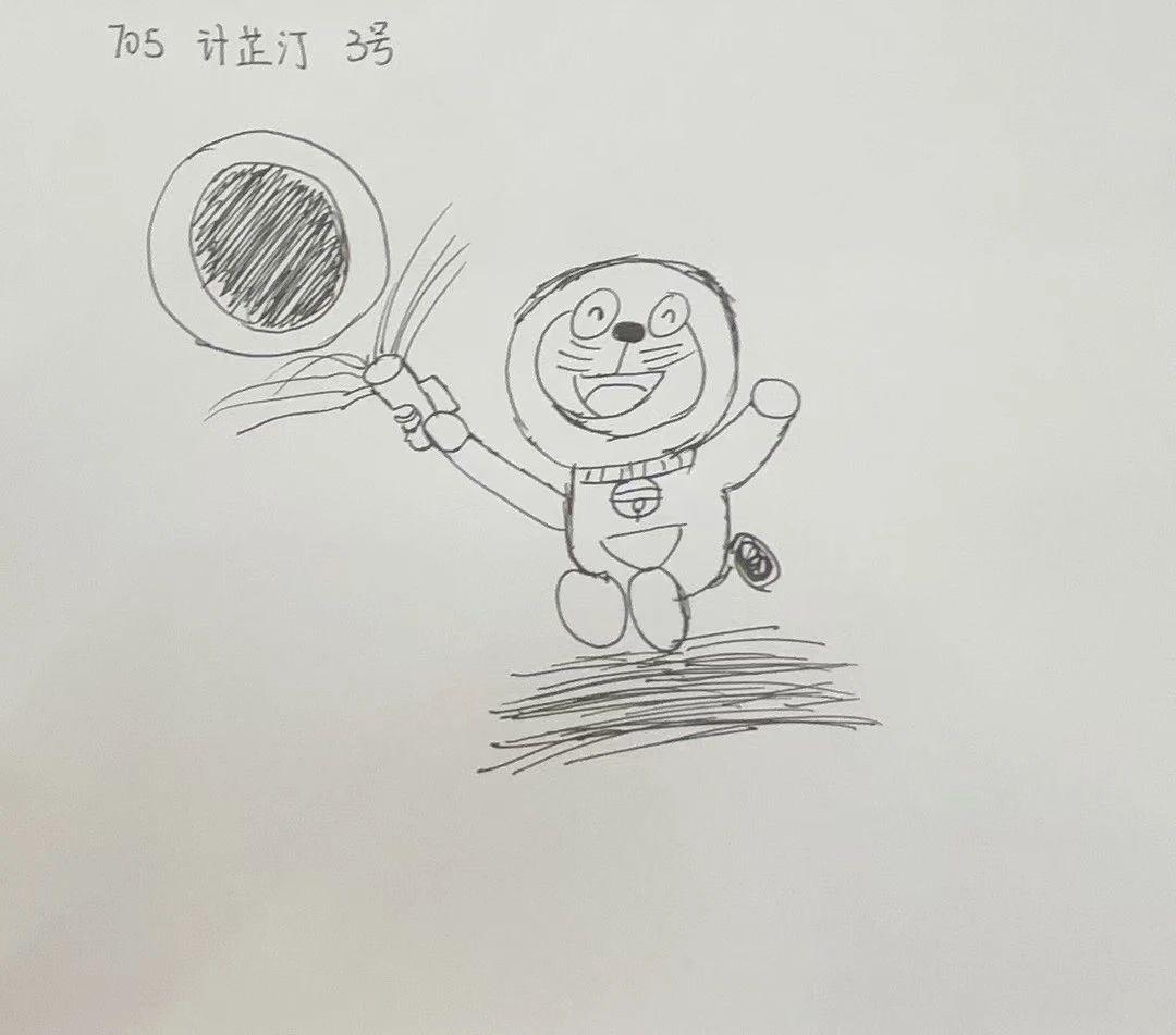 这幅手稿展示了一只卡通风格的角色,手持一个圆形物体,线条简洁且流畅,传达出欢快和生动的情感。角色的轮廓和表情设计得十分鲜明,简单的线条构成了一个充满活力的形象。整体构图具有动态感,角色向上跃起的姿态使画面充满活力,背景虽然简单但增强了角色的可爱特质。
