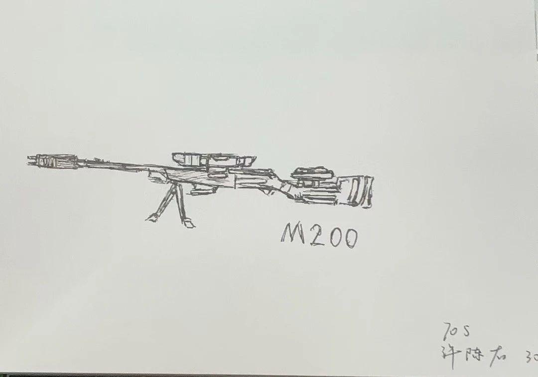 这幅手稿展示了一把狙击步枪,线条简单但明确,呈现出武器的基础形态。线条的运用虽然简洁,但有效地勾勒出枪支的轮廓。整体构图平稳,枪支被置于画面的中心位置,展现出一种静谧而凝重的氛围。手稿中保留的细节,如枪托、瞄准镜和枪管,尽管简单,却传达出精确和功能性的主题。