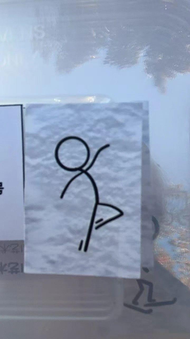 这幅作品展示了一个简单的火柴人图案,背景是模糊的环境图像。火柴人的形态动态,似乎在表达一种轻松或跳跃的姿态。整体设计简约,但具有一定的趣味性和活力。