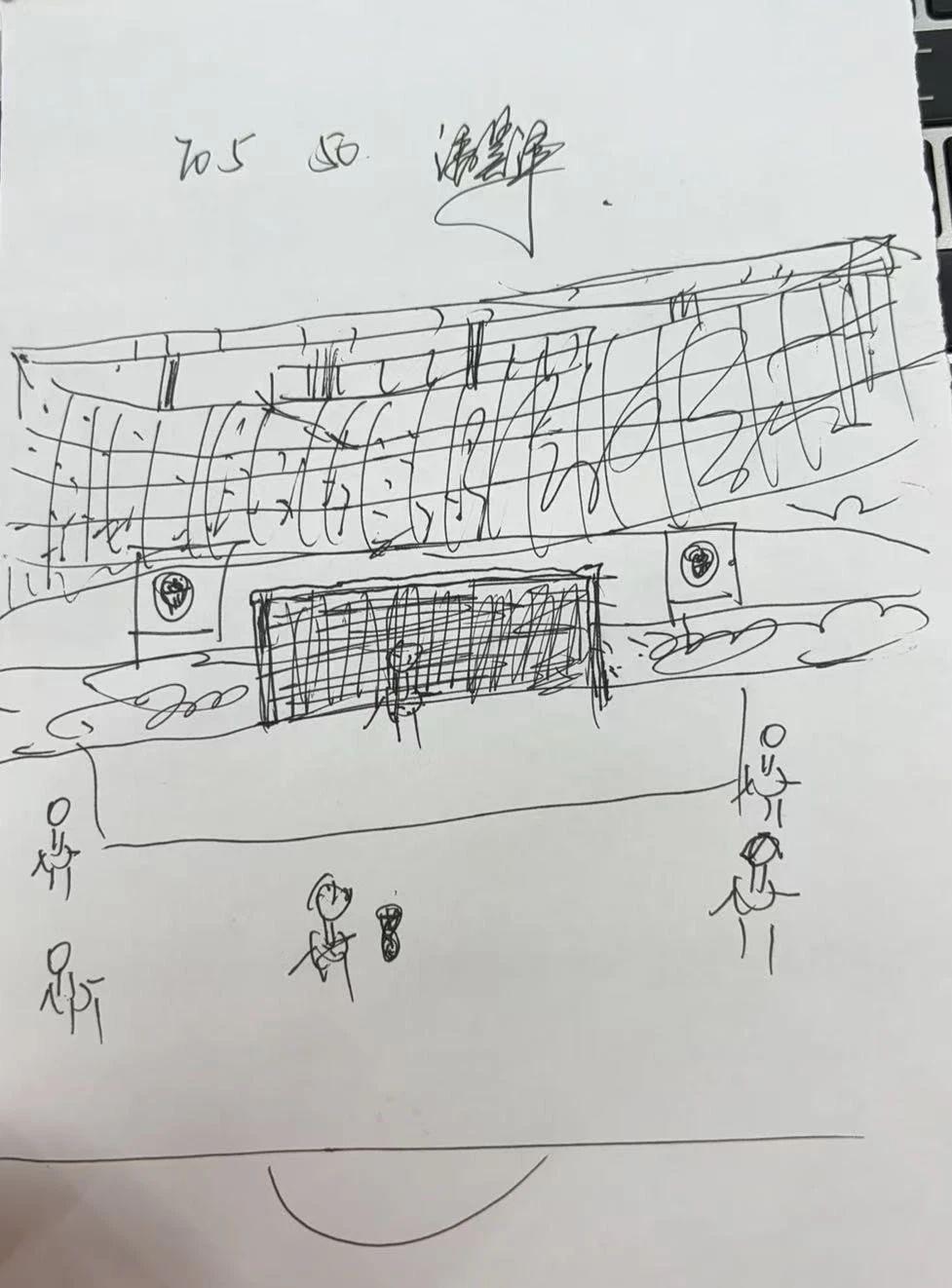 这幅手稿展示了一场足球比赛的场景,线条简洁而富有动感。画面中的线条描绘了一座大型体育场,看台上密集的笔触表现出观众的热情和喧嚣。场地中央的人物形象虽然简单,但通过他们的姿态传达了比赛的紧张氛围。整体构图平衡,前景和背景的对比使画面更具层次感,并引起观者对比赛的想象。