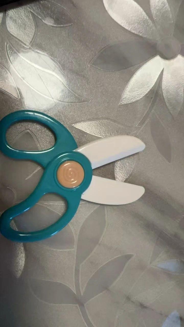 这张图片展示了一个简单而富有童趣的物品——儿童用剪刀。其色彩鲜明的蓝色和白色组合让人联想到幼儿园中常见的艺术工具。背景上的银色花纹提供了一种柔和的对比,增加了视觉层次感。为了提升作品,可以考虑在背景上加入更多相关元素,如彩色纸张或简单的手工艺品,以增强主题的立体感和故事性。在光影方面,可以引入一些柔和的自然光照,以突出剪刀的形状和质感,增加作品的活力和亲和力。