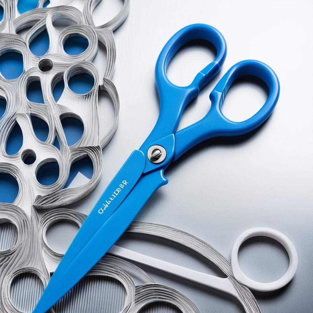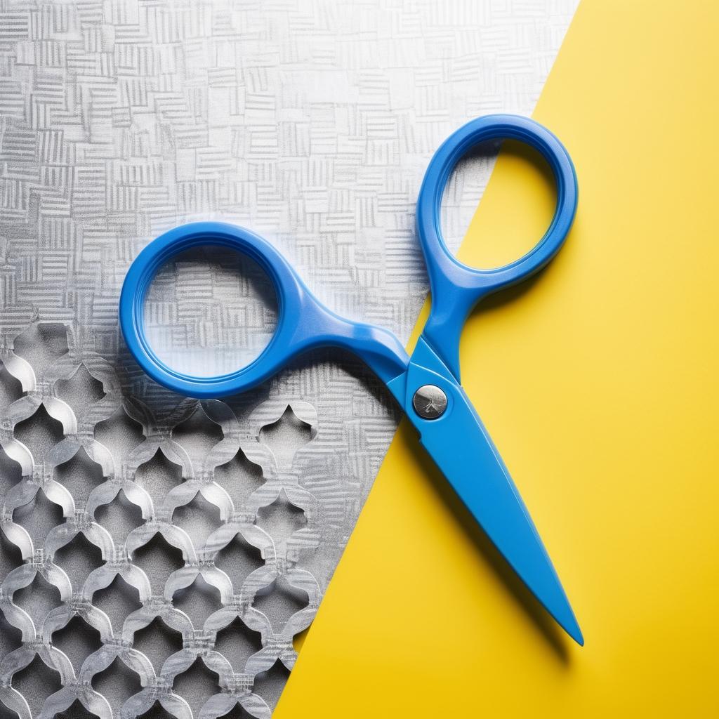这幅作品中主要元素是一个蓝色和白色的塑料剪刀,置于一个有花纹的银色背景上。整体构图简单,颜色对比鲜明,传达出一种轻松和现代的感觉。图像中的剪刀可能象征着创造力和手工艺的简单美学。