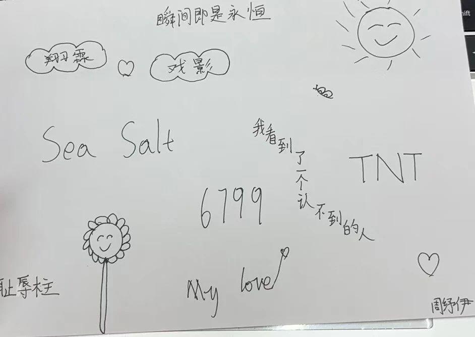 这幅手稿通过简单的线条与文字组合,呈现出一种自由与随性的艺术表达。线条流畅,形状设计简单而富有童趣,运用了多种字体和图案,如太阳和花朵,营造了一种轻松愉悦的情感氛围。整体构图不拘一格,传递出一种随意的美感。作品中含有多种元素,蕴含着个人情感与故事,给人一种自然与生活化的感觉。