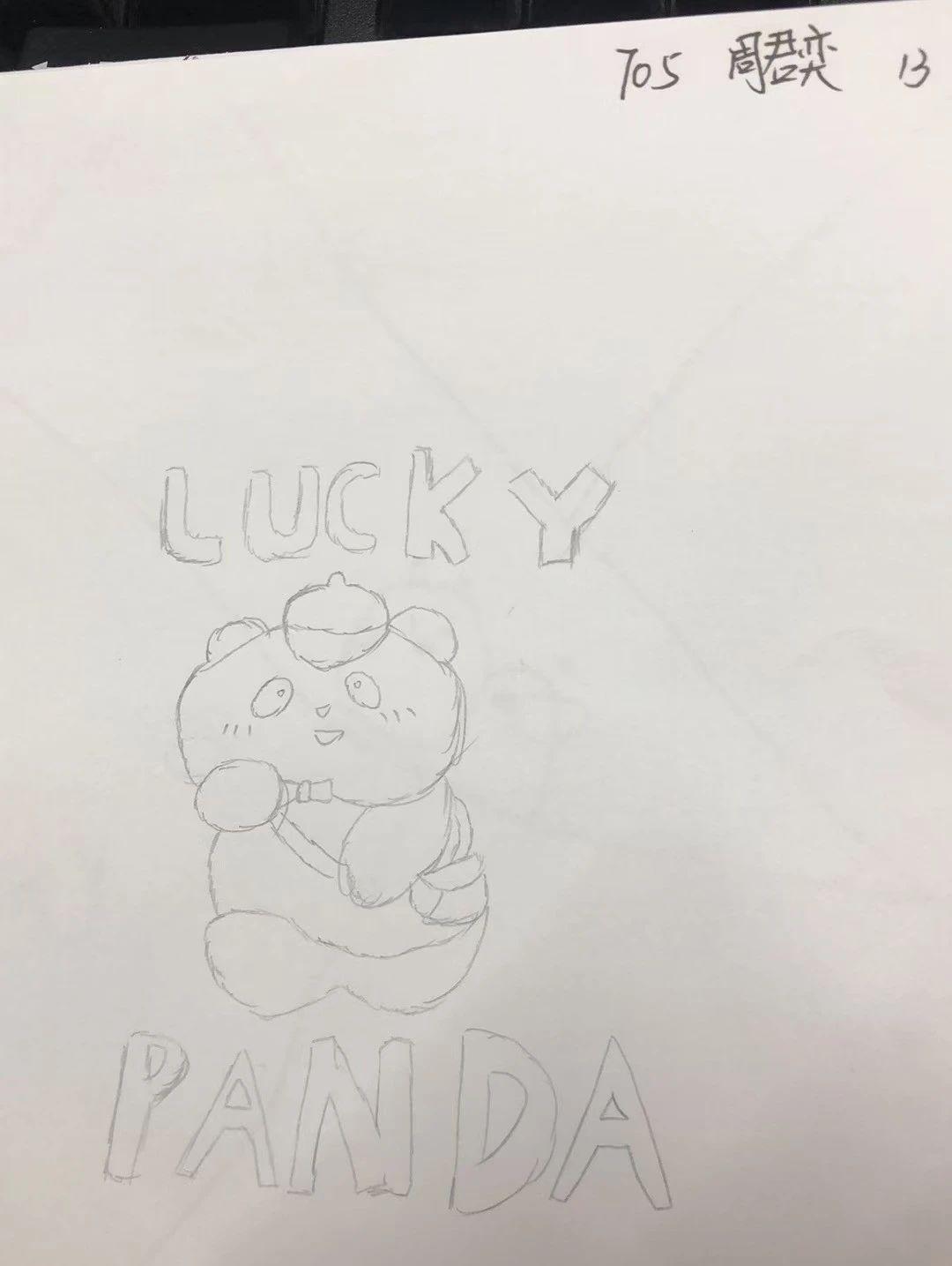这幅手稿展示了一只卡通风格的熊猫,线条简洁流畅,形象生动可爱。熊猫头上的小帽子和圆润的身体构成了独特的形状,文字 ‘LUCKY PANDA’ 则为整体增添了趣味性和主题性。作品通过简单的线条表达情感,呈现出一种轻松愉快的氛围。