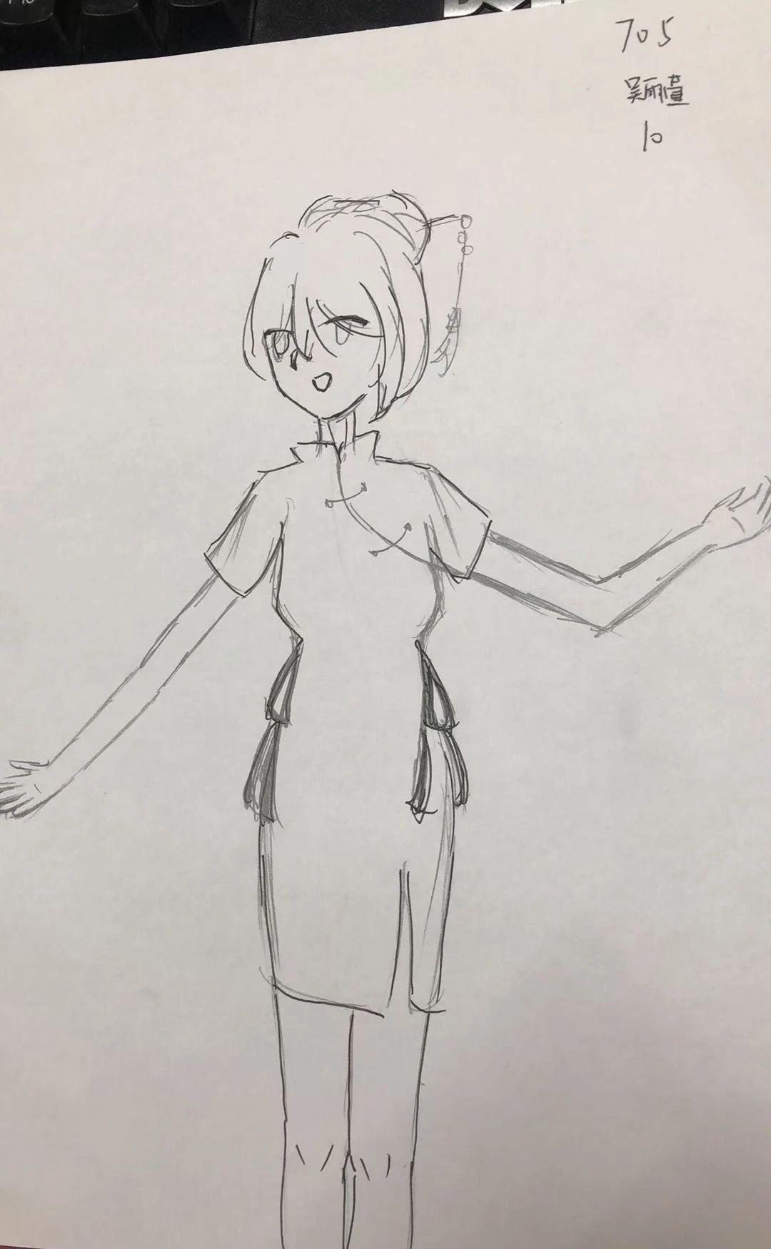 这幅手稿展现了一个简洁而富有表现力的角色设计。线条流畅,整体形象呈现出轻松愉悦的姿态。人物穿着传统服饰,细节上注意了衣物的褶皱和装饰,增添了文化元素。整体构图均衡,人物的姿势动态而开放,传达出积极的情感。