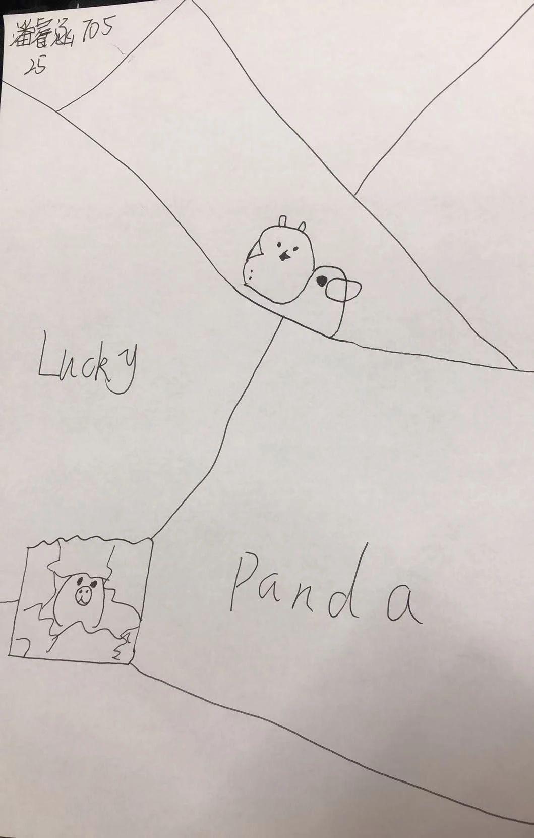 这幅手稿展示了一只可爱的熊猫形象,运用了简单而流畅的线条勾勒出动物的轮廓。线条的简洁和形状的圆润传达了一种轻松和愉悦的情感。背景的几何图形构成了一种有趣的空间感,同时也为主体提供了一个简单的舞台。整体构图平衡且充满趣味性,文字元素 ‘Lucky Panda’ 增添了作品的叙事性。