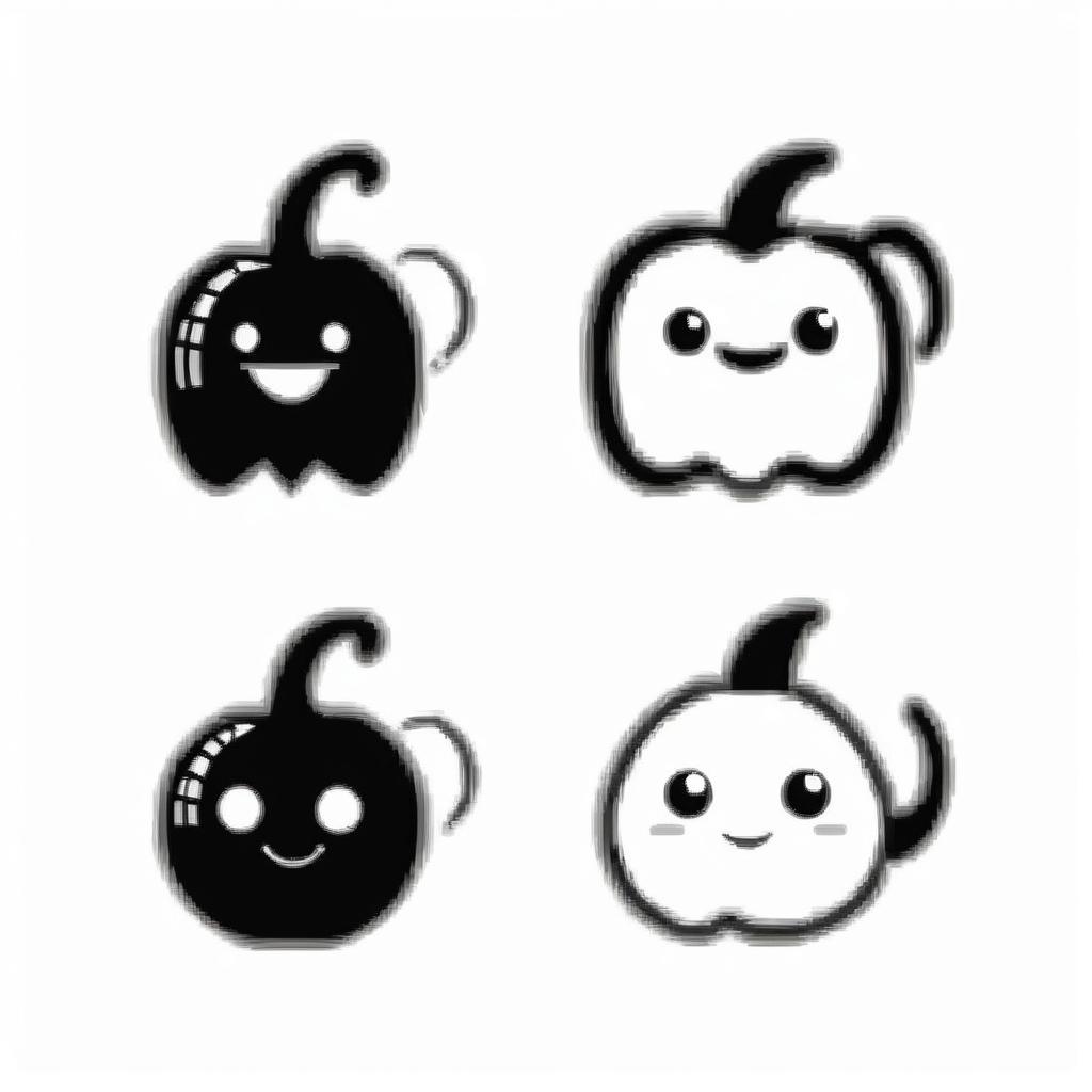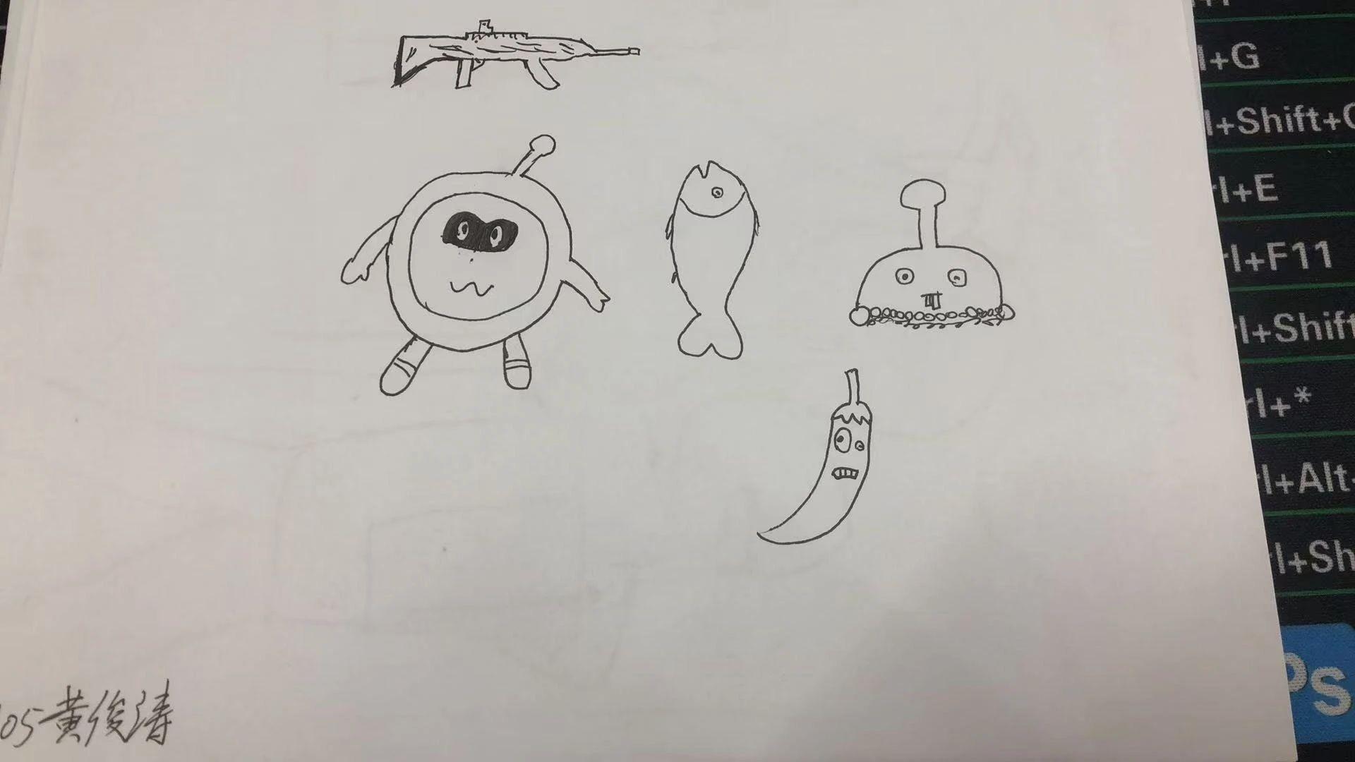 这幅作品通过简单的线条和形状描绘了几个卡通化的角色,包括一个带有表情的胡椒、鱼、一个圆形的生物和一个简化的武器图案。整个画面以黑白线条为主,没有使用复杂的细节或阴影。创作者可能想要表达一种轻松幽默的情感,带有一些童趣。