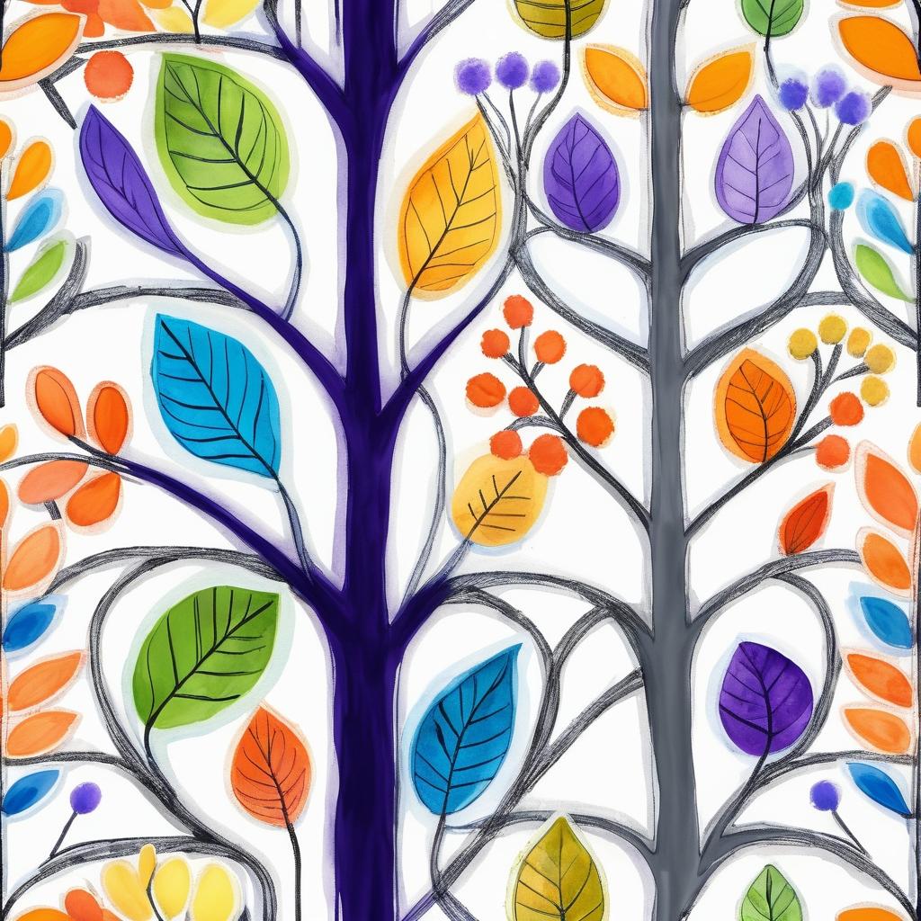 这幅作品以其简单的线条和丰富的色彩,展现了儿童艺术的独特魅力。通过灰色、紫色和橙色的搭配,作品呈现了一种生动和自然的氛围。构图中枝丫状的形态让人联想到生命的成长和多样性。手写的文字增添了个人化的表达,使得画作更加生动。儿童艺术往往以其直接和未经雕琢的表现形式吸引着观者,提醒我们回归简单和纯粹的视角。要让这幅作品更具深度,可以考虑加入一些背景元素,如阳光和自然环境的细节,这不仅丰富了视觉层次,也增添了故事性。此外,通过改变材质,如使用水彩或蜡笔,可以为作品增加更多的质感与层次感。这样的创作不仅是视觉的享受,更是心灵的启迪。