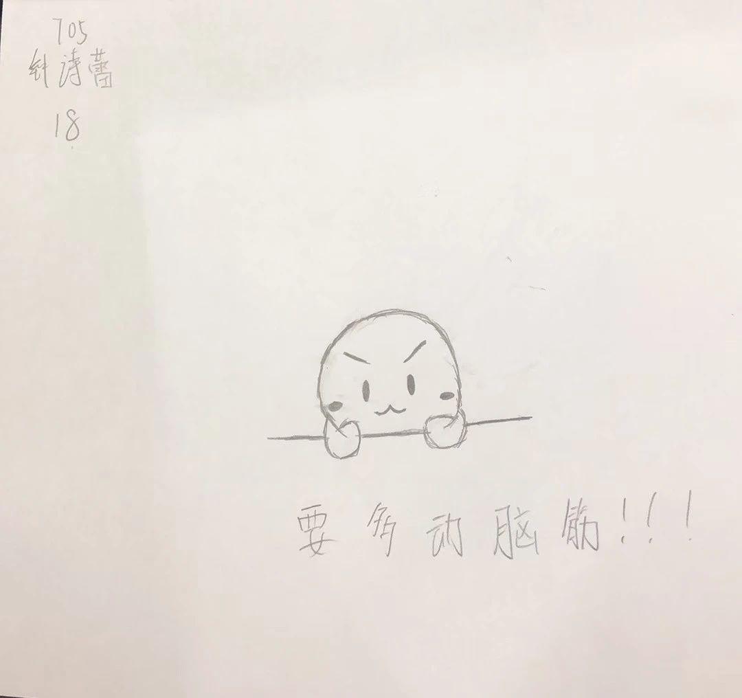 这幅作品是一幅简单的铅笔素描,描绘了一个卡通风格的小生物,露出脑袋和手,表情调皮,旁边的文字写着‘要发动脑筋’。整体构图简洁,主要元素集中在画面的下半部分,背景空白,给人轻松愉悦的感觉,传达了一种幽默和鼓励思考的主题。