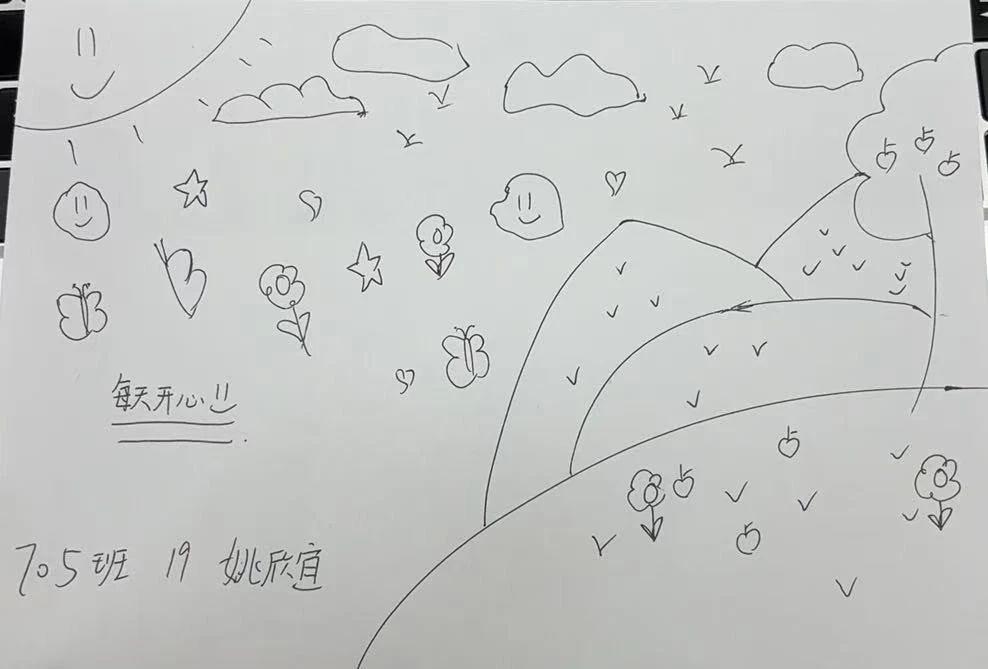 这幅作品以其简单的线条和符号构成,让人感受到一种纯真无邪的童趣。画中出现的笑脸、太阳、云朵、蝴蝶、花朵和小山丘,勾勒出一个充满快乐和希望的世界。这种表达方式常见于儿童画作中,它们通常不拘泥于真实,而是通过想象和创造来展现对世界的理解和热爱。为了让这幅作品更具艺术性,可以考虑在现有基础上进行丰富和细化。通过使用明亮的色彩来填充图形,作品可以在视觉上更具吸引力。增加背景细节,如小动物或更多的植物,也可以让画面更加生动。这种改进不仅提升了作品的视觉冲击力,还能更好地传达出一种积极向上的情感,触动观众的心灵。这样的作品,不仅仅是孩子眼中的世界,也是一种对美好生活的向往和追求。