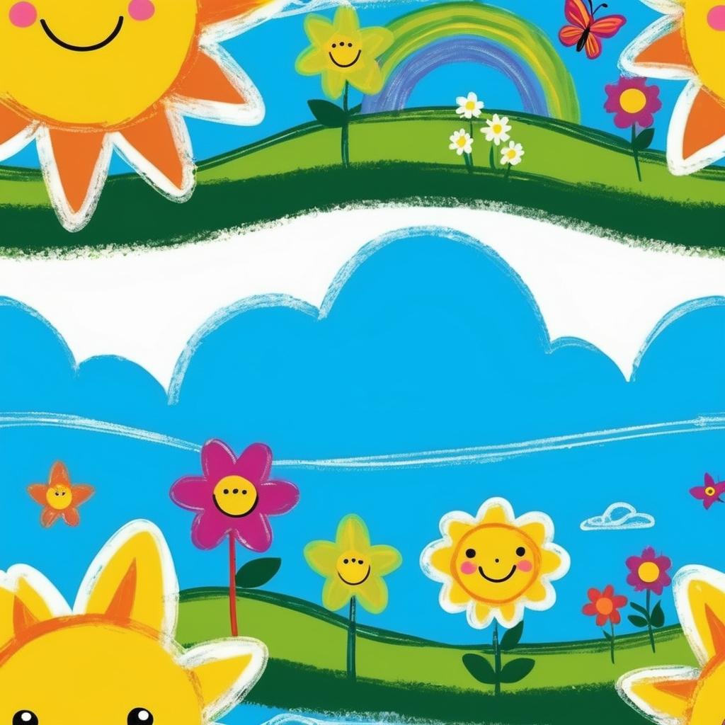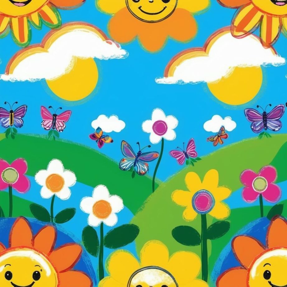这幅作品主要以简单的线条和符号构成,描绘了一个充满童趣和快乐的场景。画面中有笑脸、太阳、云朵、蝴蝶、花朵和小山丘。这些元素传达了一种无忧无虑和天真浪漫的情感,表达了对美好生活的向往和热爱。作品整体风格偏向于儿童画,富有想象力和创造力。
