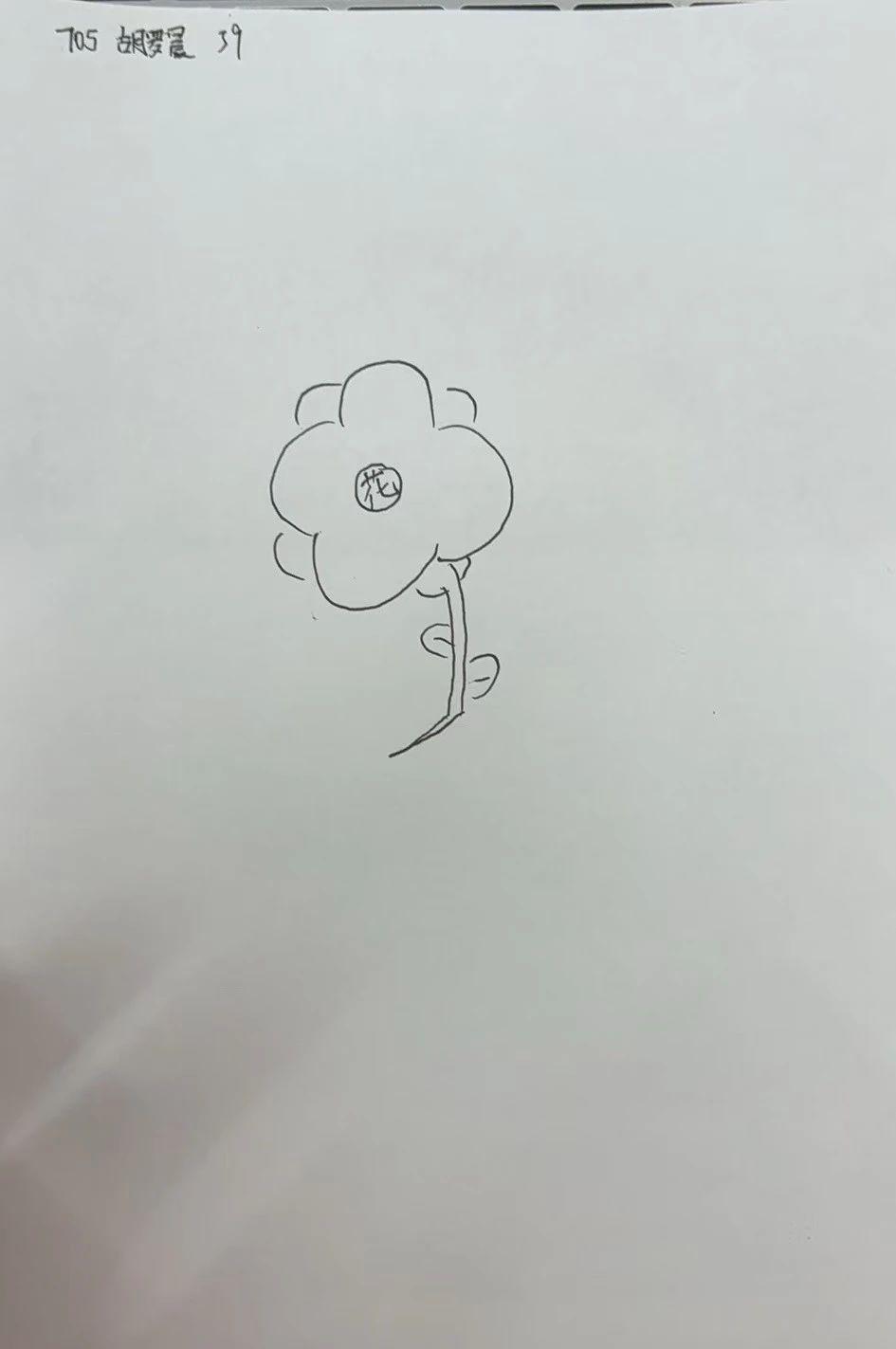 这幅图展示了一朵简单的卡通风格花朵。线条简洁,结构清晰,中央写着‘花’字,显得天真无邪。整体构图偏向于儿童画风,充满了童趣和纯真。图中的花朵占据画面中心,背景为空白,突出了主体元素。