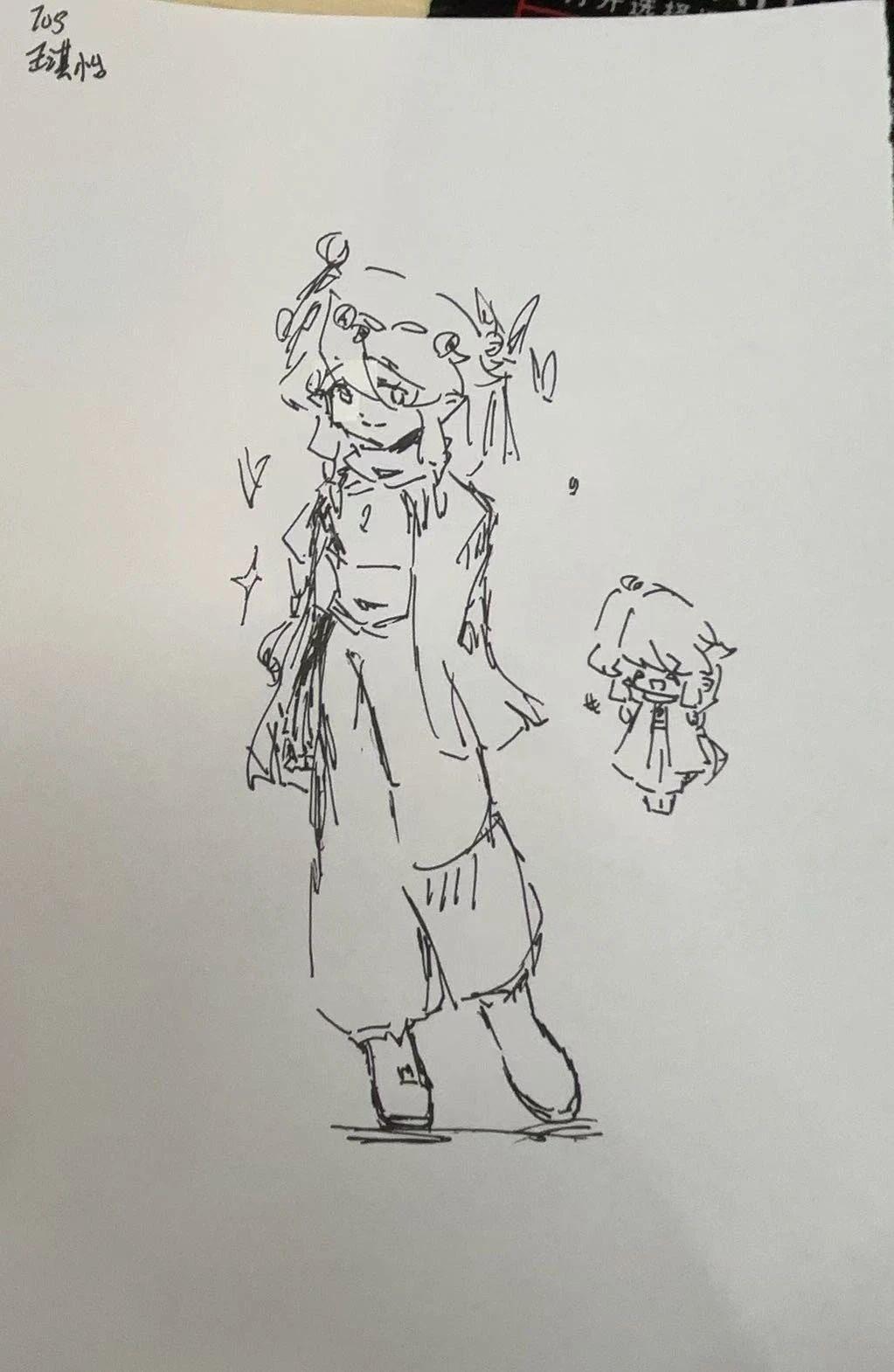 这幅作品是一幅简约的线条画,描绘了一个人物角色,具有卡通风格。画面中主要使用了黑色线条,形象生动而且富有动感。角色的发型和服装设计具有独特的风格,展现了一种轻松和愉悦的氛围。旁边还有一个缩小版的角色形象,增加了趣味性。创作者可能在表达一种现代、自由的生活方式或个性。