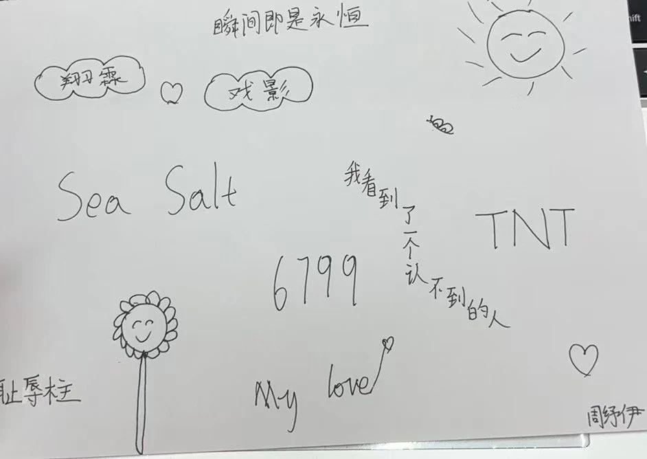 这幅作品是一幅手绘涂鸦,包含文字和简单的插图。主要元素包括手写字母、数字、笑脸太阳、花和爱心等符号。整体风格随意,呈现出一种轻松和个人化的表达方式。作品中有文字表达情感,如‘瞬间即是永恒’、‘我看到了一个认不到的人’等,可能传达作者的内心独白和瞬时感受。