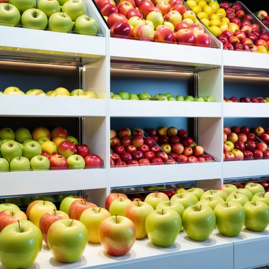 这幅图展示了一组整齐排列的高级水果礼盒。画面中主要元素包括苹果的颜色(黄色、红色、绿色)、整齐的排列和背景的宣传海报。这些礼盒摆放在一个木质桌面上,周围有产品介绍牌。整体色调温暖,传达了丰收和富裕的主题,同时也有一种节日的气氛。