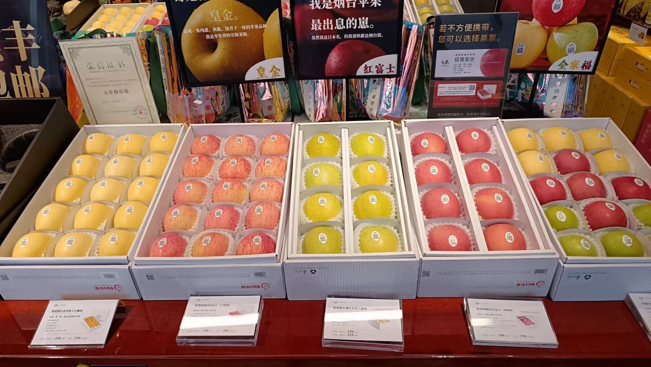 这幅照片展示了一排整齐排列的水果礼盒,色彩鲜艳、排列有序的苹果和梨构成了视觉上的对称美感。光影效果柔和,突出水果的新鲜感和表面的光滑质感。背景中的文字和包装进一步强调了产品的高端定位,整体给人一种奢华且现代的购物体验。