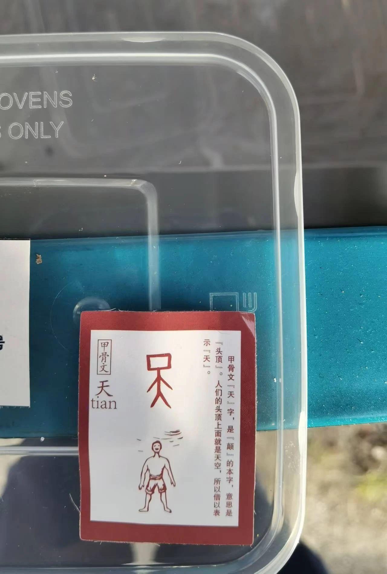 图片中的主要元素是一个带有甲骨文“天”字的纸片,上面有关于这个字的解释和一个简单的人物插图。背景是一个透明的塑料容器盖子,整体色调较为简单,主要以白色和蓝色为主。作品传达了对古代汉字的文化和历史背景的介绍,营造了一种文化传承的氛围。