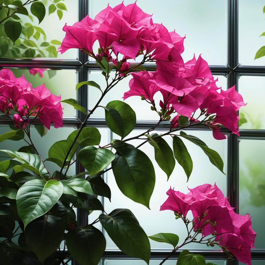 这幅作品呈现了一株盛开的九重葛,鲜艳的粉红色花朵在阳光下显得尤为夺目,与绿色的叶子形成鲜明对比。背景中的玻璃和金属框架带给画面一种现代感,同时也让植物的自然之美更加突出。构图上,植物的枝条呈现出自然的弧形,增添了画面的动感。