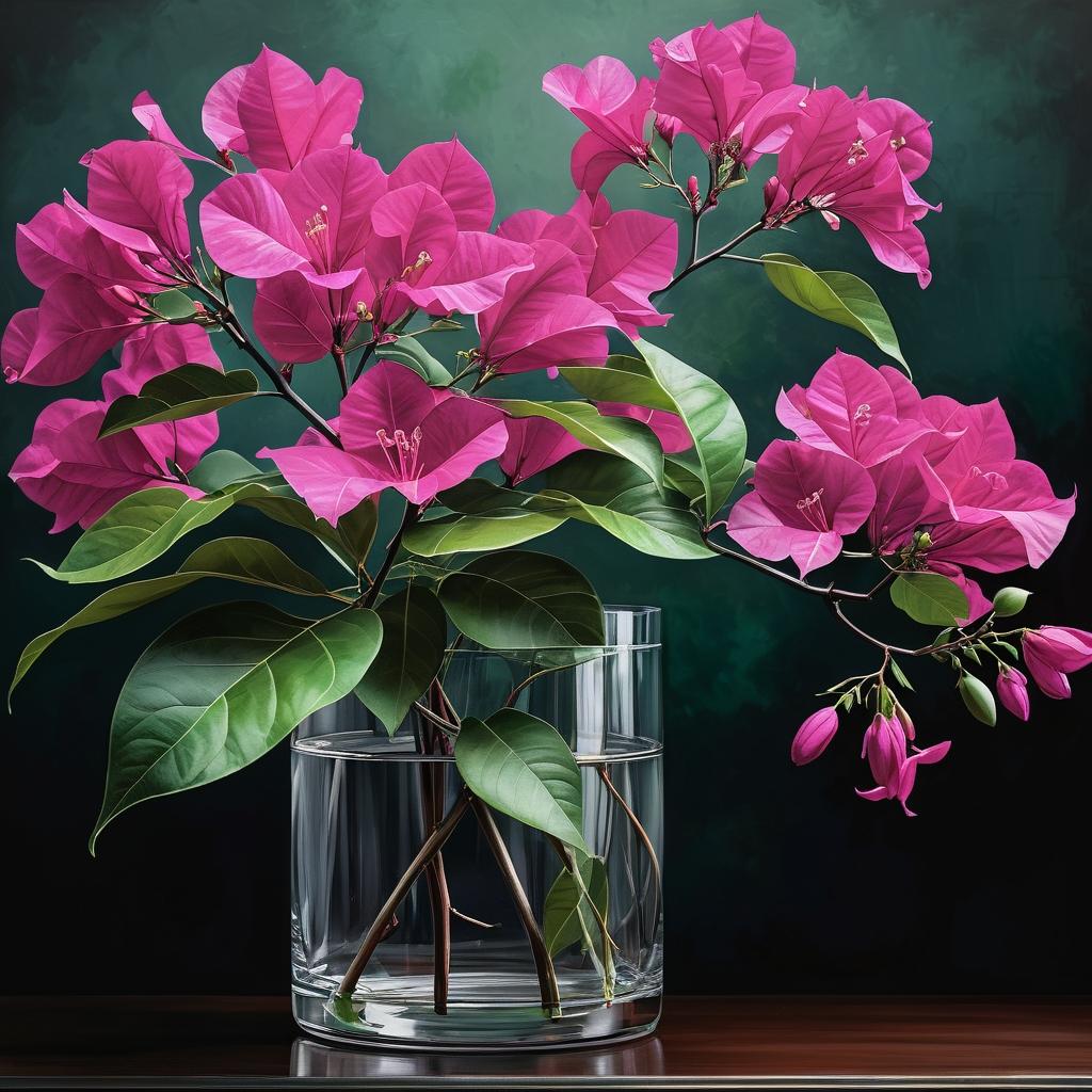 在这幅作品中,九重葛的鲜艳色彩与现代背景形成了鲜明的对比,使得植物的自然之美得以充分展现。九重葛常被称为‘纸花’,其薄如蝉翼的花瓣在阳光的照射下,色彩更加艳丽动人。画面中的植物不仅是自然景观的一部分,同时也是展现生命力的一种媒介。通过对枝条自然弯曲的描绘,作者赋予了作品一种流动的美感。为了进一步提升这幅作品,可以考虑在背景中加入更多光影变化,丰富画面的层次感。同时,增加对叶片与花瓣的细节刻画,将有助于提升画面的真实感和艺术感染力。总的来说,这幅作品在表达植物内在美感的同时,也通过现代元素的融入,使其在视觉上更具冲击力。