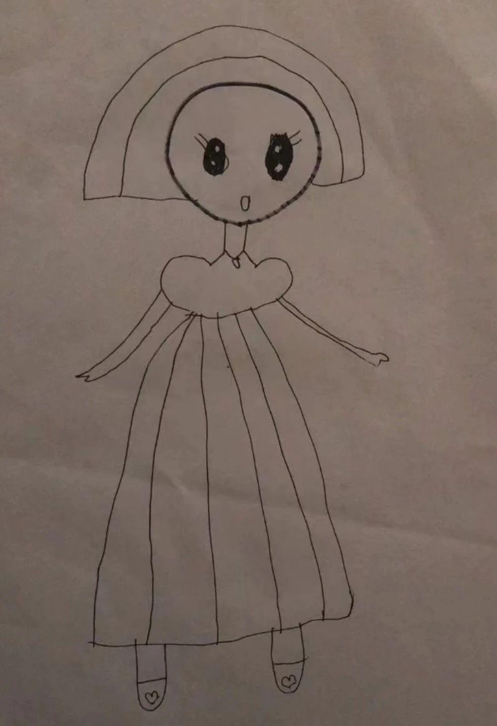 这幅手稿中的人物具有简洁而童趣的风格,展现了一位穿着长裙的女性角色。人物的姿态直立,面部表情简单且富有卡通感,服装设计元素如心形鞋饰为温馨的节日主题提供了潜力。整体构图简单,背景为空白,因此可以加入更多节日元素来丰富画面。
