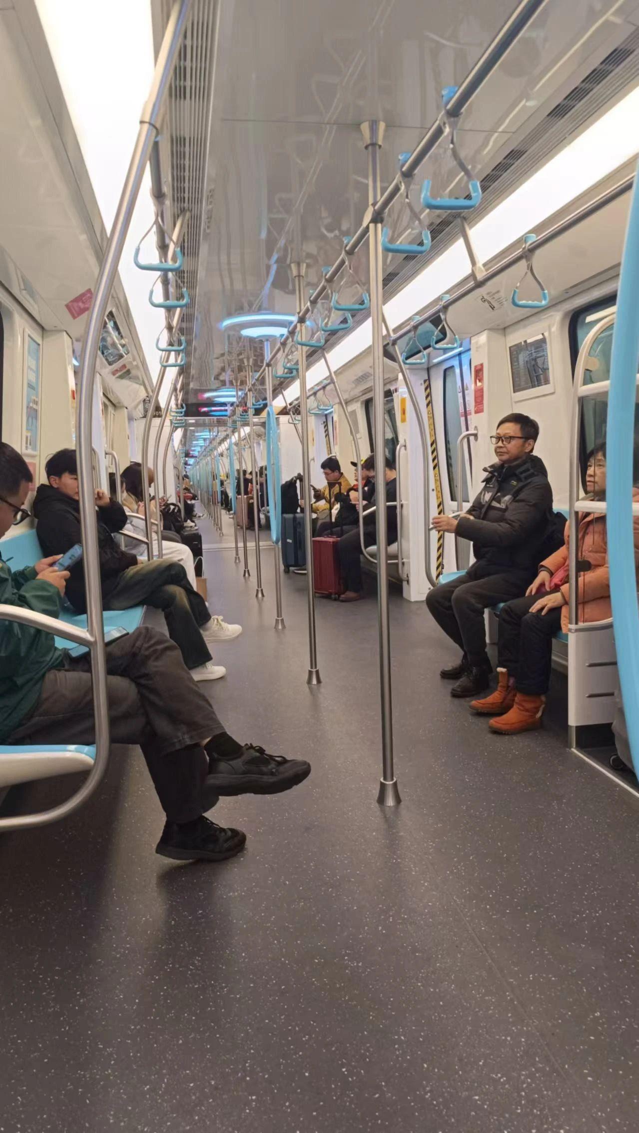 这幅作品展现了地铁车厢内的日常场景,包含多个人物。人物的姿态主要是坐着,其中一些人在使用手机,穿着冬季服装。光线柔和,车厢内的蓝色座椅和扶手构成了画面的主要色彩元素。整体构图较为对称,但缺乏明显的节日元素。