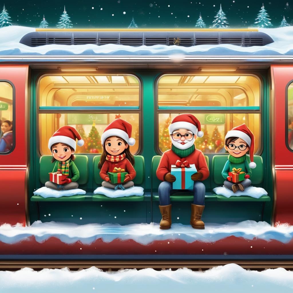 这幅作品通过将地铁车厢的日常场景转化为圣诞节主题,巧妙地结合了现代都市生活与传统节日氛围。虽然原图缺乏明显的节日元素,但通过添加圣诞帽、围巾及小礼物盒等细节,整个画面焕然一新。顶部的灯饰和窗外的飘雪效果进一步增强了节日的感染力,使观者能感受到冬日的温暖与节日的欢乐。这种设计特别强调了人物的姿态与表情,将他们的日常情感与节日喜悦结合,创造出一个充满个性化和情感共鸣的圣诞贺卡。