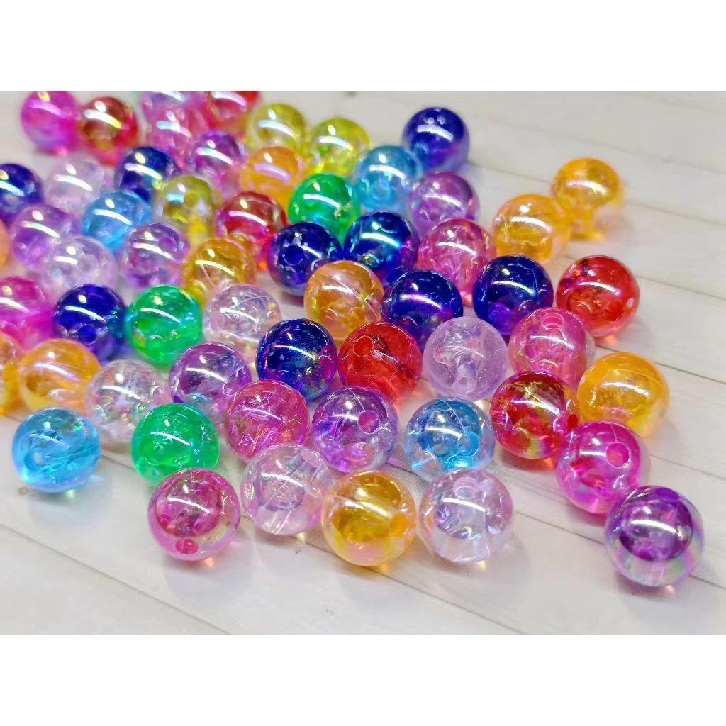 这张图片展示了多种颜色的圆形玻璃珠,颜色包括粉色、蓝色、绿色、黄色、橙色和紫色。串珠数量较多,随机散落排列。色彩鲜艳,具有透明的光泽感。