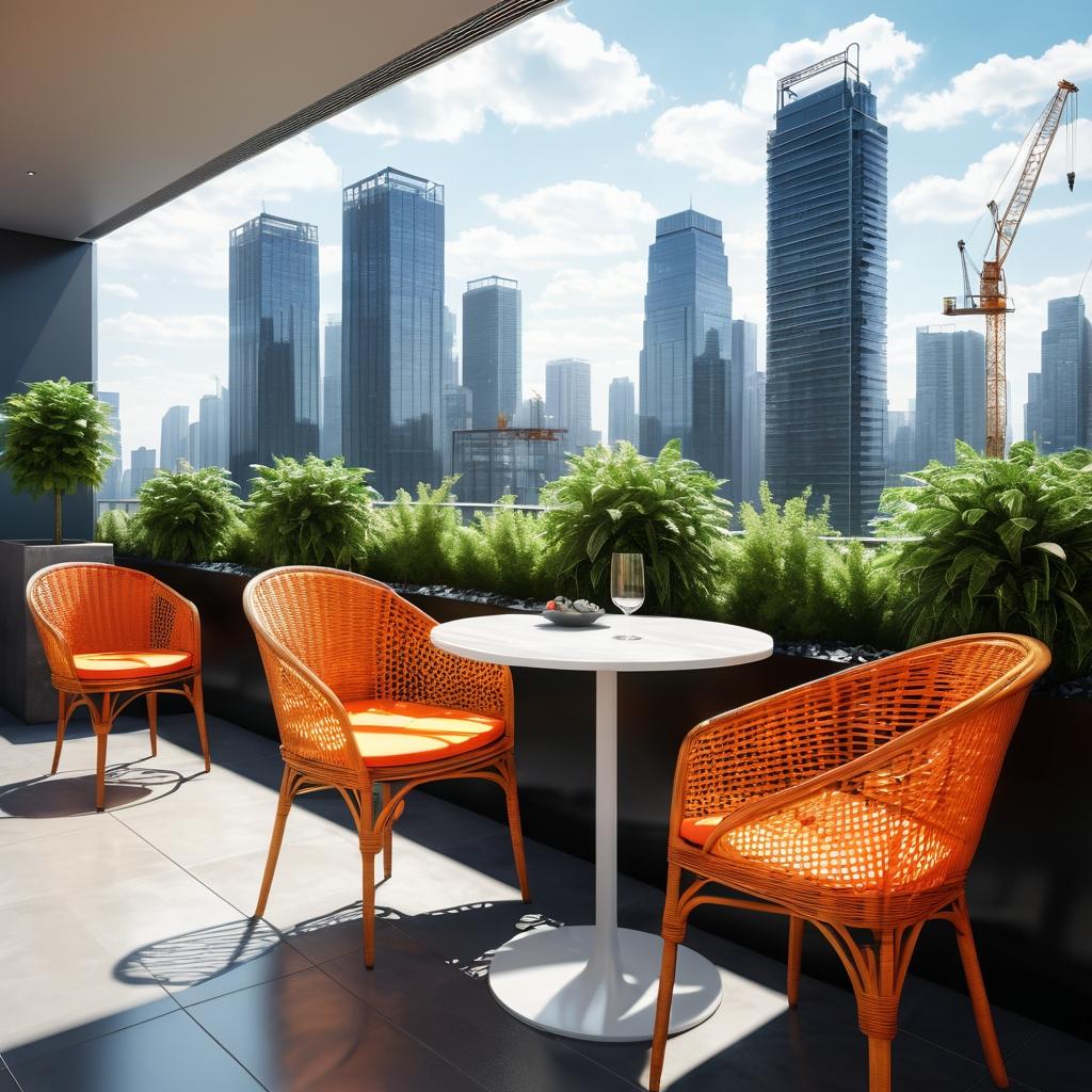 这幅作品展示了一处城市中的露台景观,前景是几张藤制的椅子和玻璃桌,背景则是现代的高楼建筑和正在施工的塔吊。植物的生机与背后的钢筋水泥形成对比,表现出自然与城市的融合。画面色调自然,阳光照射下的玻璃桌面反射出明亮的光影,增添了活力。