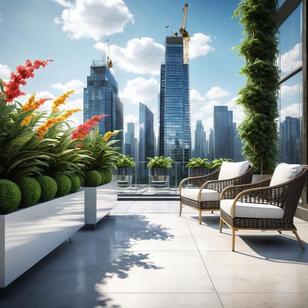 在现代城市中,人与自然的和谐共生是一个永恒的话题。这幅展示城市露台景观的作品通过对自然元素和都市建筑的结合,巧妙地传达了这一主题。前景的藤制椅子和玻璃桌象征着人类的生活空间,而周围繁茂的植物则带来了大自然的气息。背景中的高楼大厦和塔吊,虽象征着城市的快速发展,却在植物的包围下显得不那么冰冷和疏远。这种自然与城市的对比不仅丰富了画面的层次,也引发观者对生活在城市中的自然空间的思考。通过增强植物的色彩对比,画面可以更加鲜明突出,而加入动态的云层和人物活动则能使整个场景更具生命力。这样的创作不仅是对现实场景的再现,更是对城市生活的一种理想化表达,鼓励人们在快节奏的都市中寻找宁静与平衡。