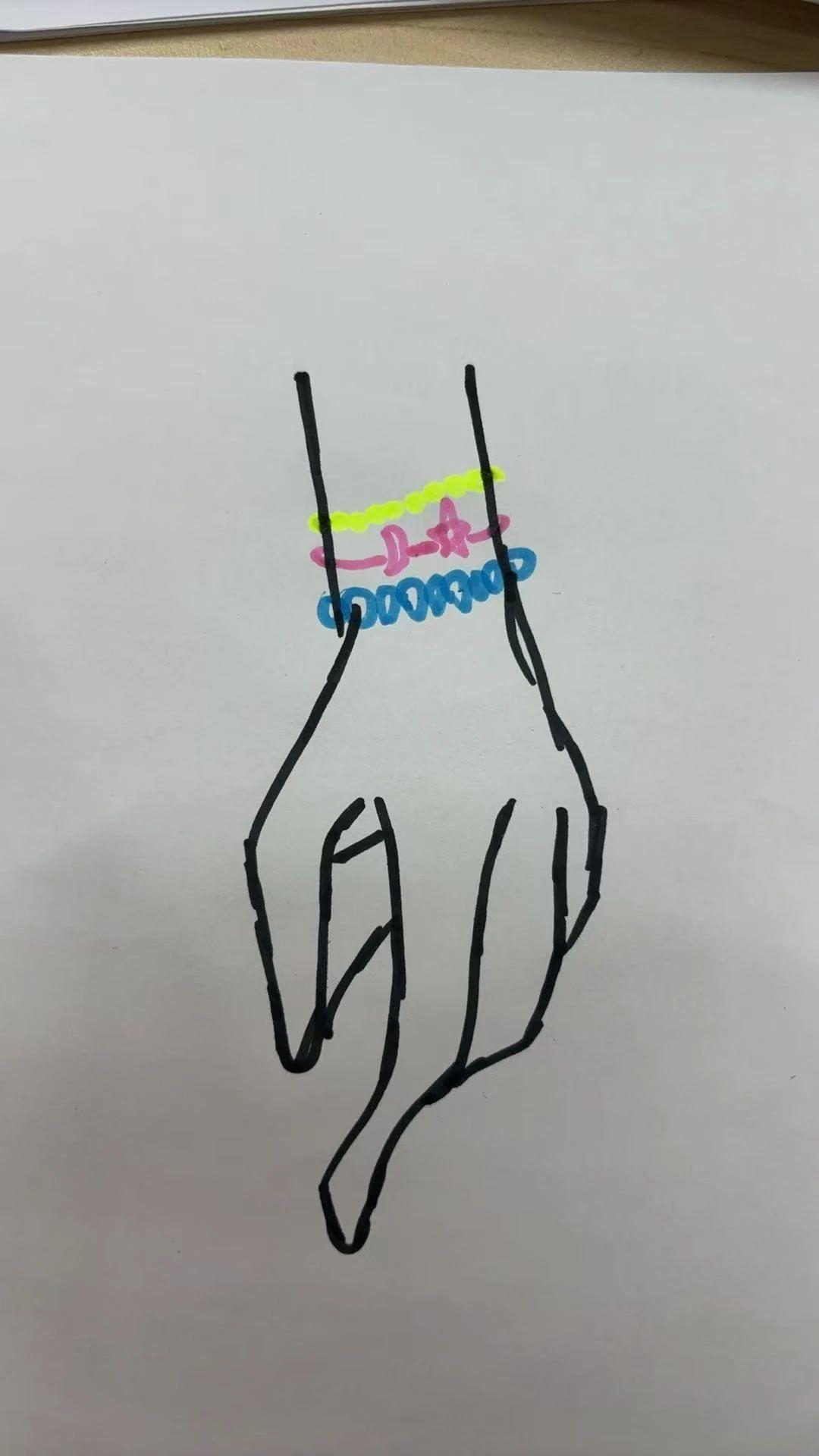 在这幅手绘设计中,我们看到三种鲜明的颜色:黄色、粉色和蓝色。这些颜色通过圆形串珠紧密排列,形成了有趣而现代的视觉效果。设计中,串珠的形状和颜色直接影响了整体风格的呈现,体现了现代简约主义的精髓。通过减少串珠的种类和复杂度,我们可以更好地突出颜色的对比与协调。同时,串珠的排列方式也强调了简洁与平衡,这种设计理念在当代珠宝设计中愈发受到欢迎。结合目前极简主义的趋势,我们可以通过选择透明或哑光材质,进一步提升作品的艺术性与功能性,使其既适合日常佩戴,又能彰显佩戴者的独特品味。