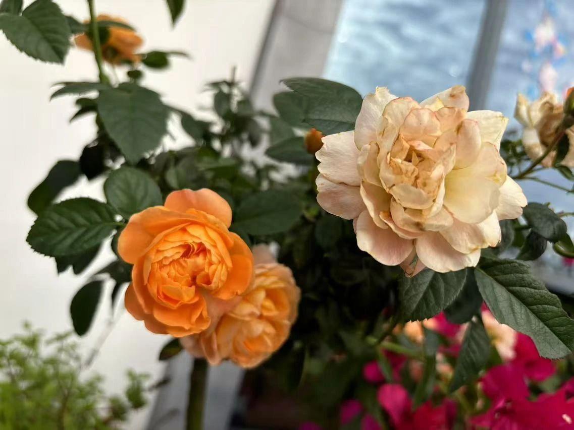 这幅图像展示了两朵色彩鲜艳的玫瑰花,背景是模糊的自然环境,可能是室内植物园或阳台。橙色和奶油色的花朵在绿叶的衬托下显得格外突出,传达出一种自然的美感和宁静的氛围。图像的构图着重于花朵的细节,细腻的花瓣纹理和色彩渐变增加了视觉吸引力。
