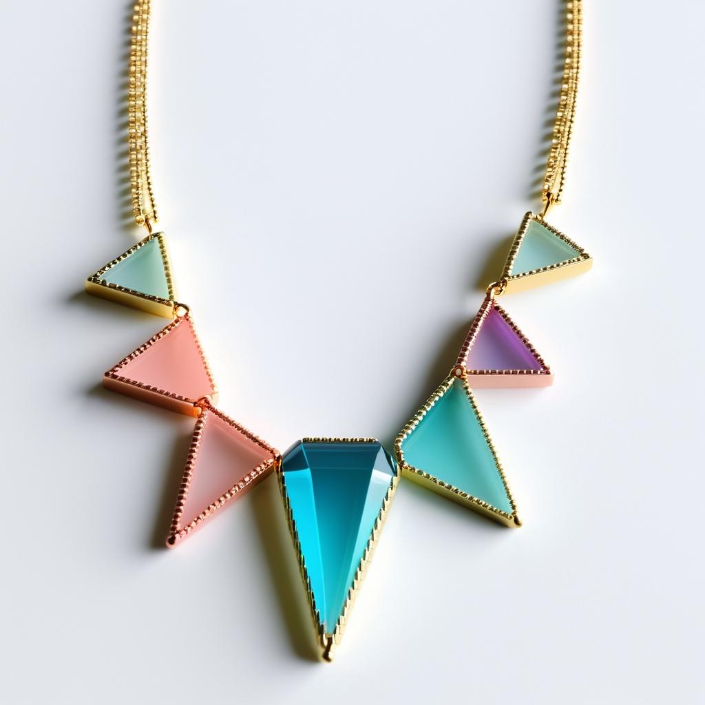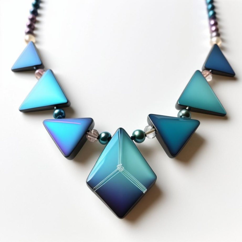 通过减少串珠的种类,突出三角形的几何对称性和排列的连续性,体现极简主义美感。在设计中可以通过增加一些不规则的蓝色串珠作为点缀,增加视觉趣味和动态感。使用渐变或低饱和度的色调,结合磨砂玻璃或金属材质,提升设计的现代感。