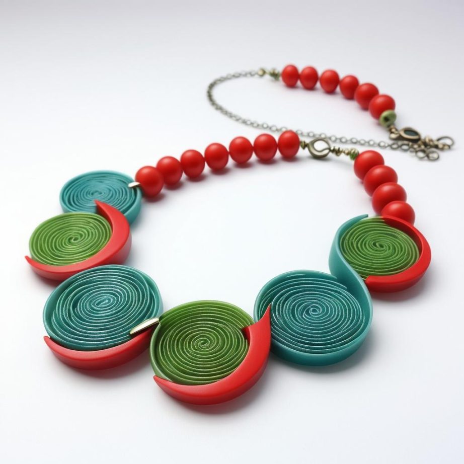 这幅手稿展示了一条串珠项链设计,主要由几种色彩鲜艳的珠子组成。珠子的形态多为圆形和不规则形状,颜色包括绿色、红色、蓝色和橙色。项链整体呈现出环形,左侧和右侧对称排列着红色螺旋形状和绿色叶状装饰,底部有一个蓝色蝴蝶结装饰。整体设计具有自然和活力的元素。