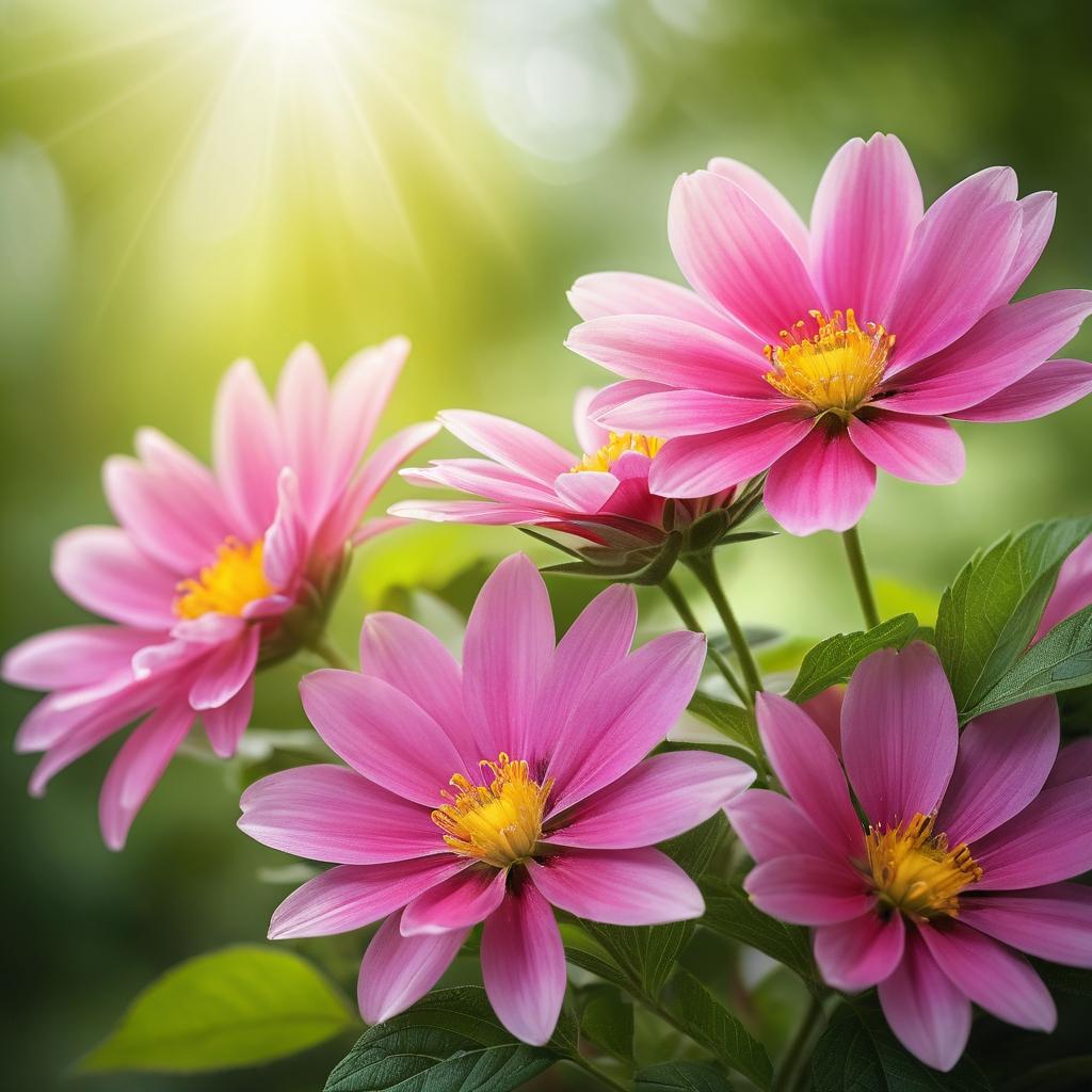 这幅作品以粉色和绿色为主色调,展示了一簇盛开的花朵,背景略显模糊,使花朵成为视觉焦点。构图中,花朵的姿态和颜色传达了一种生机勃勃和自然之美的情感。创作者可能意图表达自然的纯净和生命的活力。