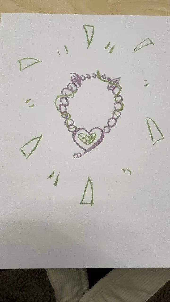 这幅手绘图展示了一条以心形吊坠为中心的串珠手链。使用了圆形和椭圆形的串珠,主要有紫色和绿色两种颜色。串珠大小不一,沿手链不规则排列。整个设计具有对称性,心形吊坠作为视觉焦点。周围的几何形状装饰增加了设计的趣味性。