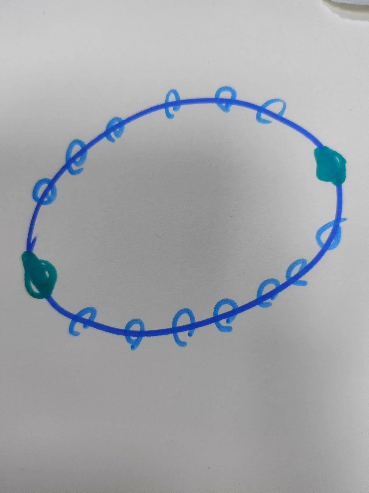 该图展示了一个简单的手绘设计,主体为一个椭圆形结构,包含若干小圆环和两个较大的不规则形状的装饰物。串珠的种类似乎是基于颜色和形状的抽象表现。整体设计较为简单,采用的是单一色调的蓝色线条和绿色装饰物,排列方式对称且均匀。