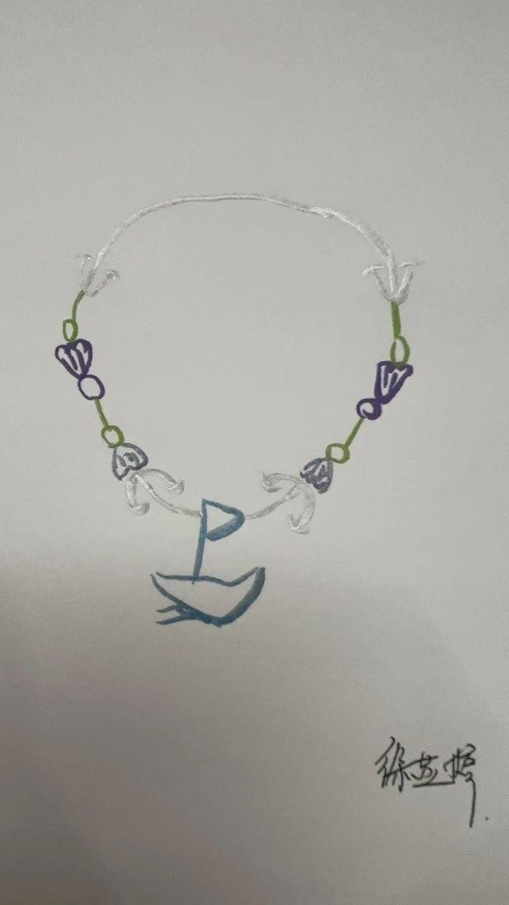 这张手稿描绘了一条项链设计,其串珠呈现出独特的几何形状和线条流动性。串珠类型包括抽象的花朵和叶片形状,颜色以蓝色、绿色和白色为主,形成柔和的对比。整体设计具有轻盈感,线条流畅,强调了现代简约风格的美学。元素的排列不对称,增加了设计的动态感和现代感。